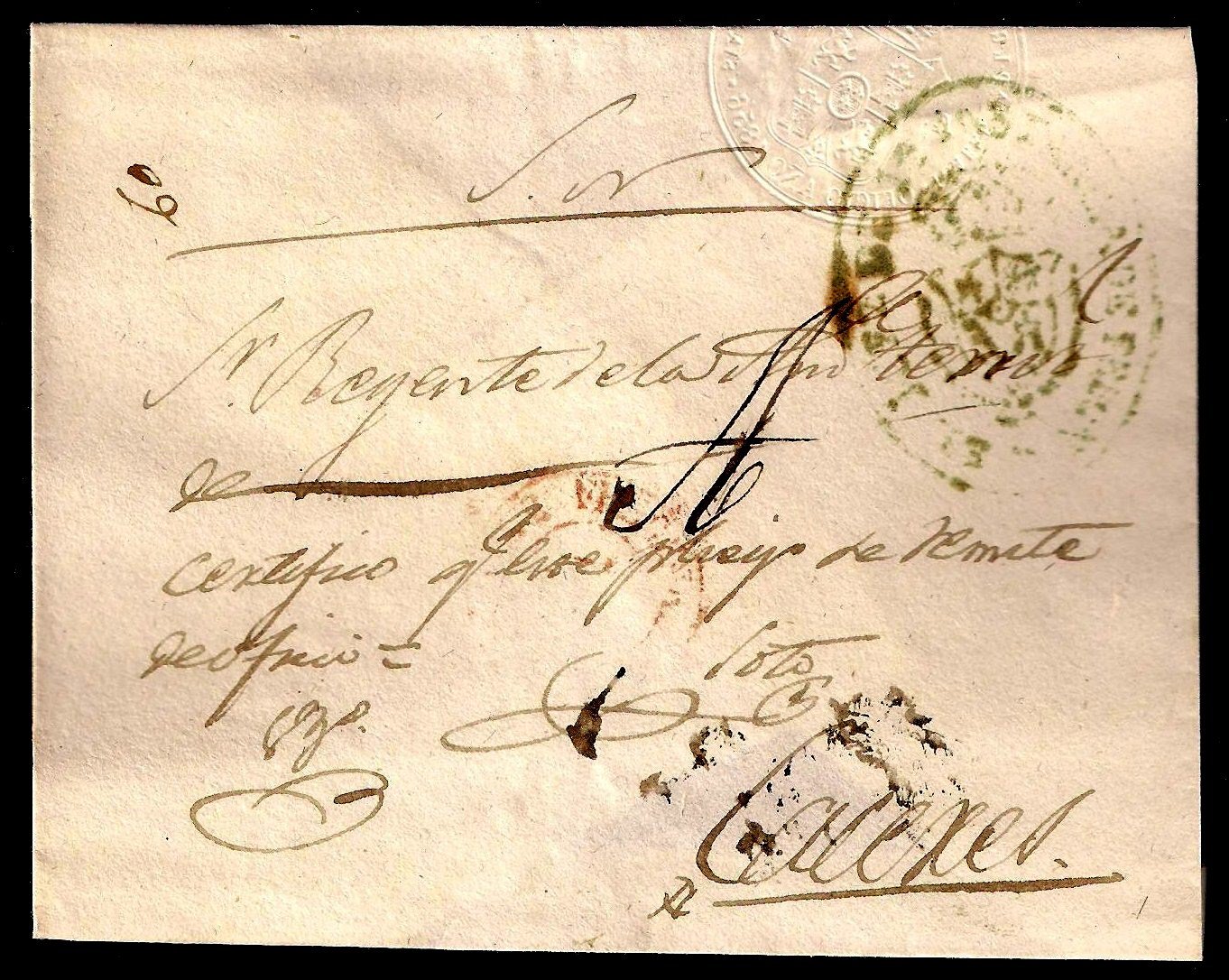 El oficio es del Ayuntamiento de Novilla (Zaragoza y va dirigida a Cortes de Navarra con tránsito por Mallen donde se matasellan los sellos con el fechador 8 de Agosto, dos veces sobre los sellos y una tercera estampación también en esa fecha, en la parte superior nuevamente se estampa el fechador pero ya con fecha 9 de Agosto, creo salvo error un típico ejemplo de Después de la Salida.