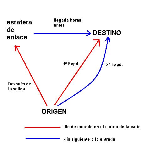 Es decir la carta se manda por otra carrera para que a su vez enlace, al día siguiente , con la salida de una población de esa carrera con la población final, adelantando la llegada con respecto a si la carta saliese con la expedición del día siguiente desde origen.