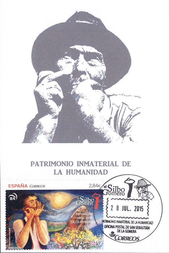 Dos tarjetas máximas con los matasellos de "PRESENTACION de la Emisión" y "TURISTICO" de EL SILBO GOMERO como PATRIMONIO INMATERIAL DE LA HUMANIDAD Oficina Postal de San Sebastián de la Gomera.