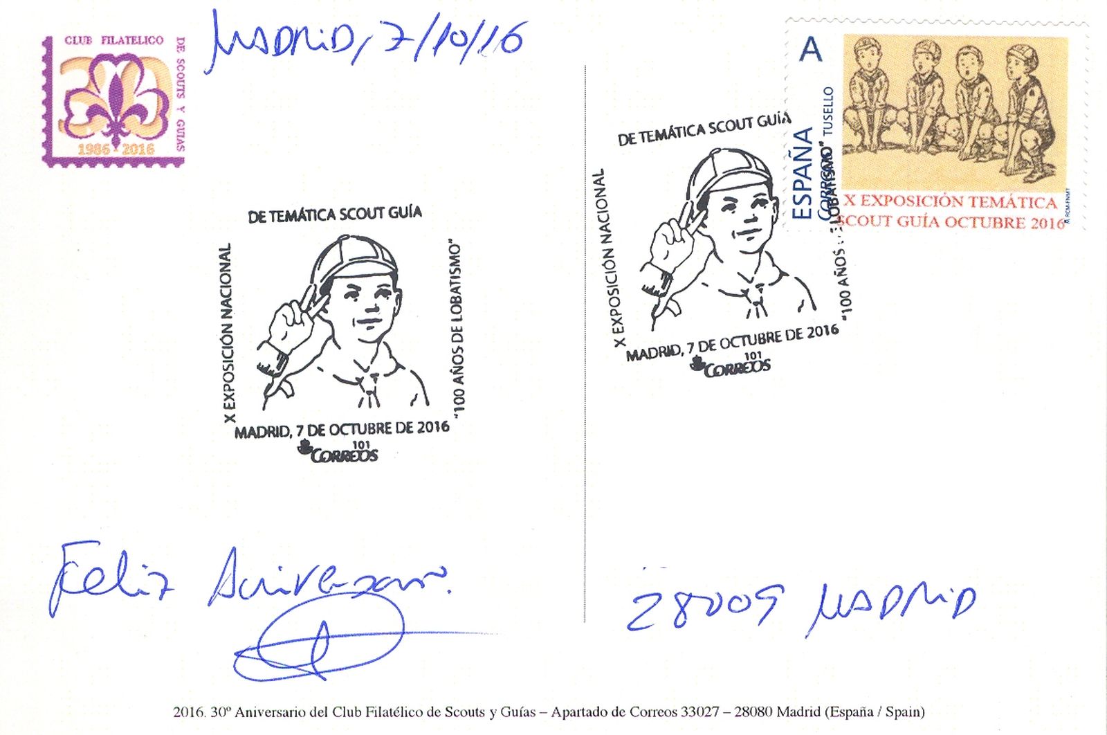 Madrid. 2016-10-07 al 15. X Exposicion Nacional de Tematica Scout-Guia. Tarjeta postal. Anverso. Baja.jpg