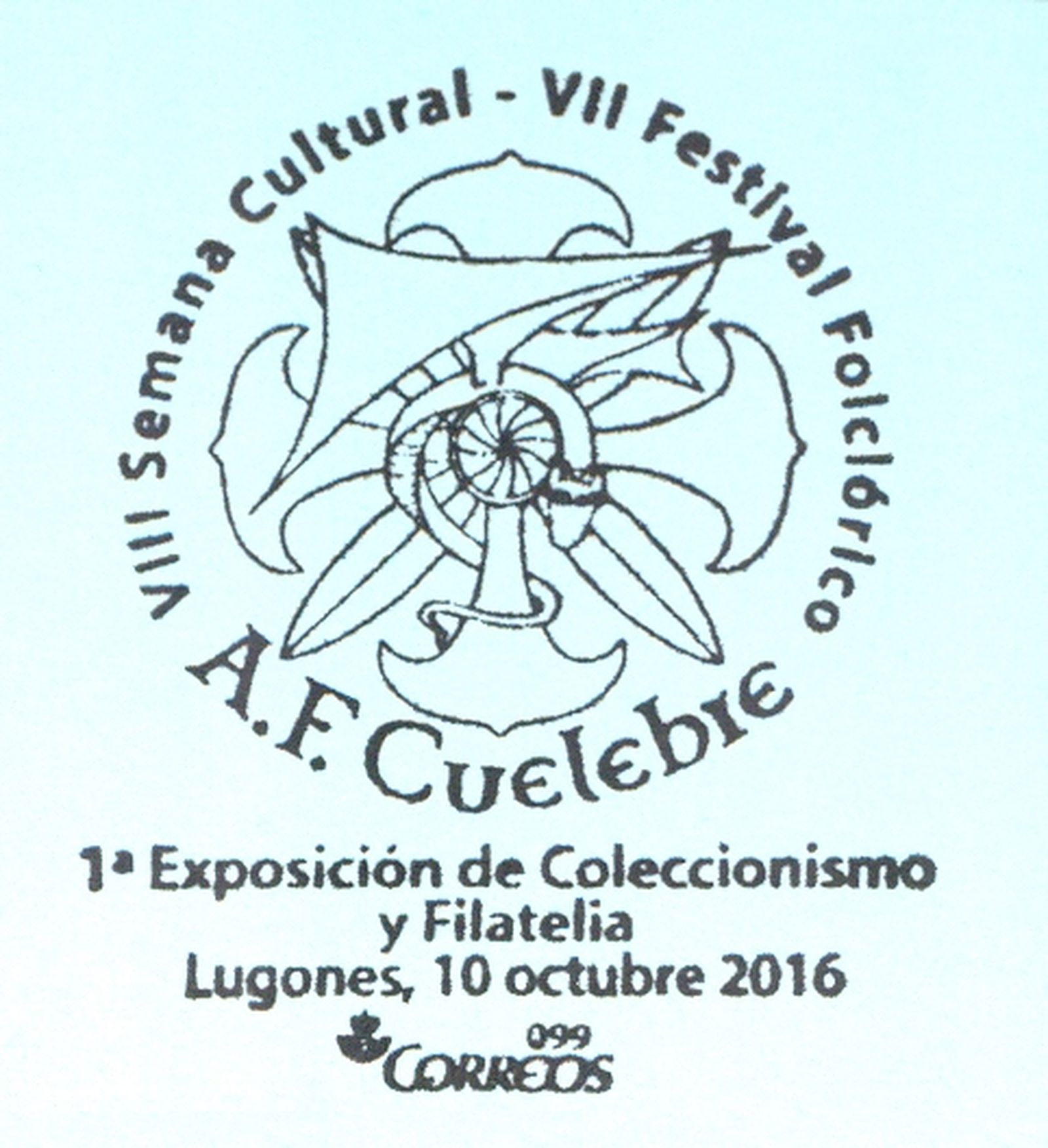 La décima novena de ellas del año 2016 (18/2016, ya que existe una 12a) hace referencia al matasellos, utilizado en Lugones (Siero) con motivo de la celebración de la VIII Semana Cultural y VII Festival Folclórico organizados por la Asociaicón Folclórica Cuélebre de Lugones (Siero), y de la 1.ª Exposición de Coleccionimo y Filatelia de la Agrupación de Coleccionistas de Asturias (ACOAS).