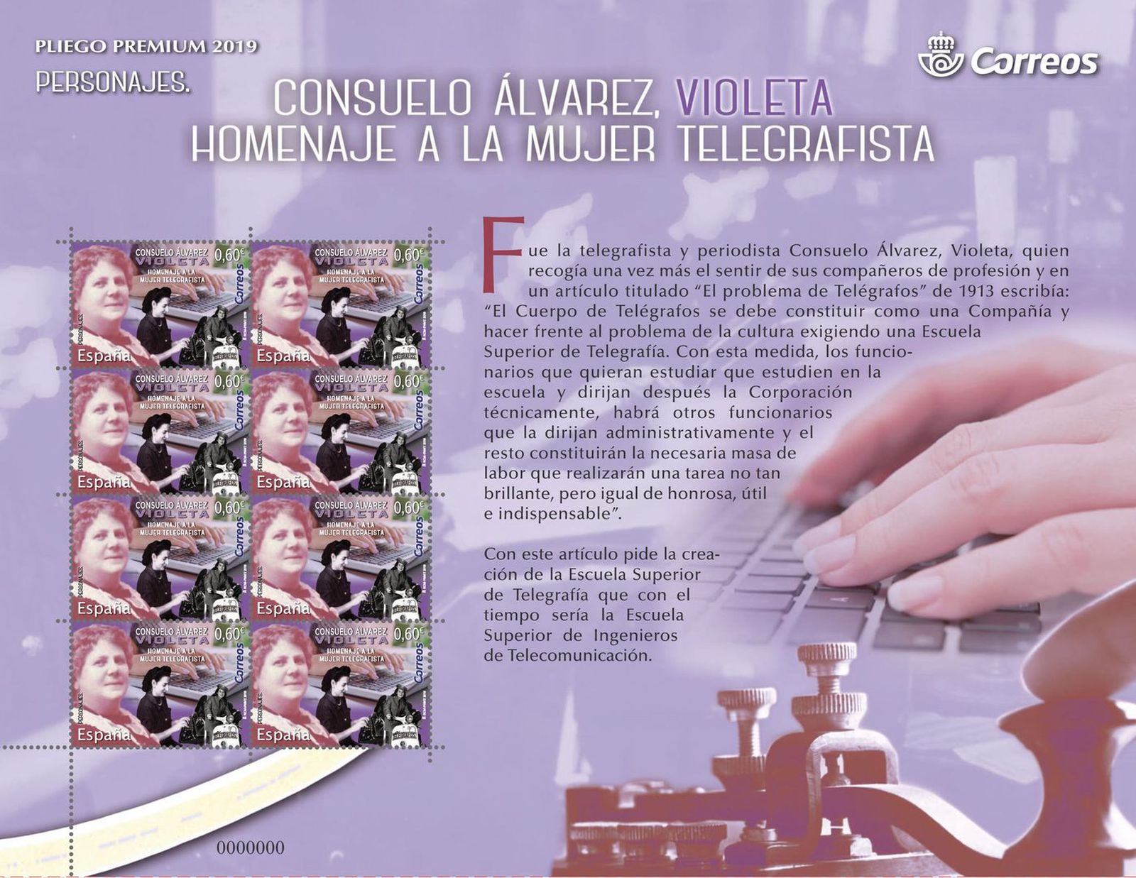 Correos ha querido rendir homenaje a las mujeres telegrafistas en la figura de Consuelo Álvarez, Violeta a través de un sello en el que además de su retrato podemos ver otras mujeres telegrafistas terminando en unas manos con un teclado de ordenador como metáfora de la evolución de las telecomunicaciones. Este sello además se presenta en un pliego Premium de 8 efectos en el que el violeta lo tiñe todo.