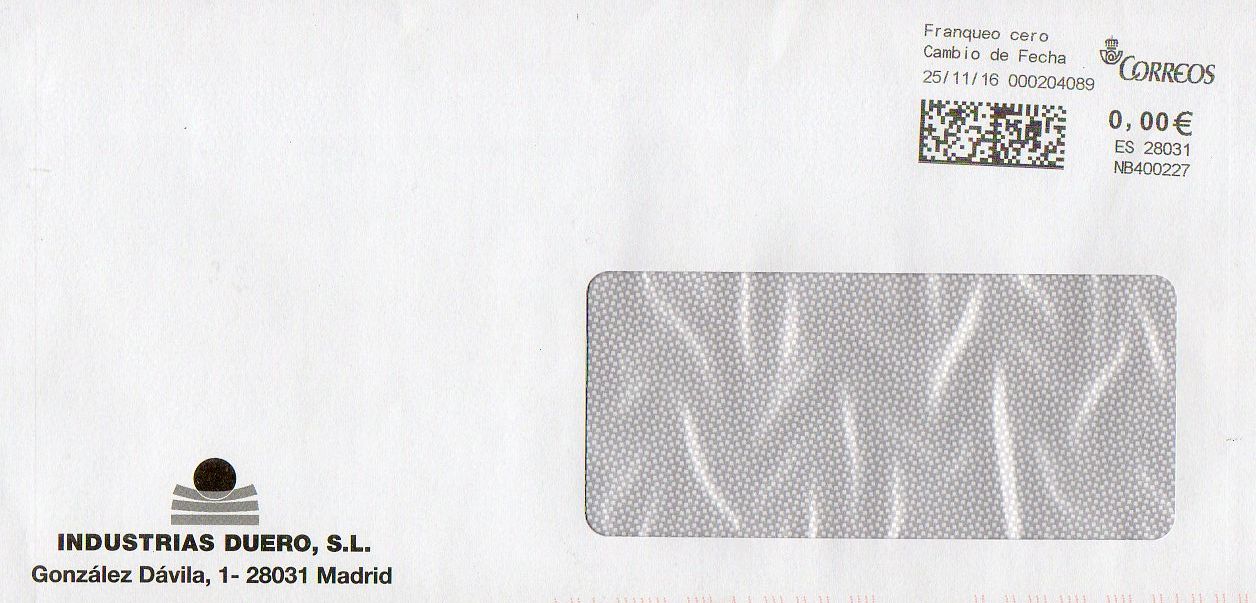 Pues no pasará nada, Rafa. Si pasan las rojas de TECNICAS DE FLUÍDOS , que por su color son mas llamativas...las negras pasarán los filtros igualmente ( a no ser que los motivos sean políticos :mrgreen:) . Y para demostrar que Correos es más chulo pues pongo otro ejemplo de FRANQUEO CERO de una NB4 ya catalogada...bueno, mas chulos o mas listos: Si el "jefe" de INDUSTRIAS DUERO es cuñao del empleado de Correos(y seguro que viven muy cerquita el uno del otro: CP.2831), desconecta la máquina del teléfono y así no se controla ese gasto :lol: y todos contentos...dejo las drogas o que? :lol: