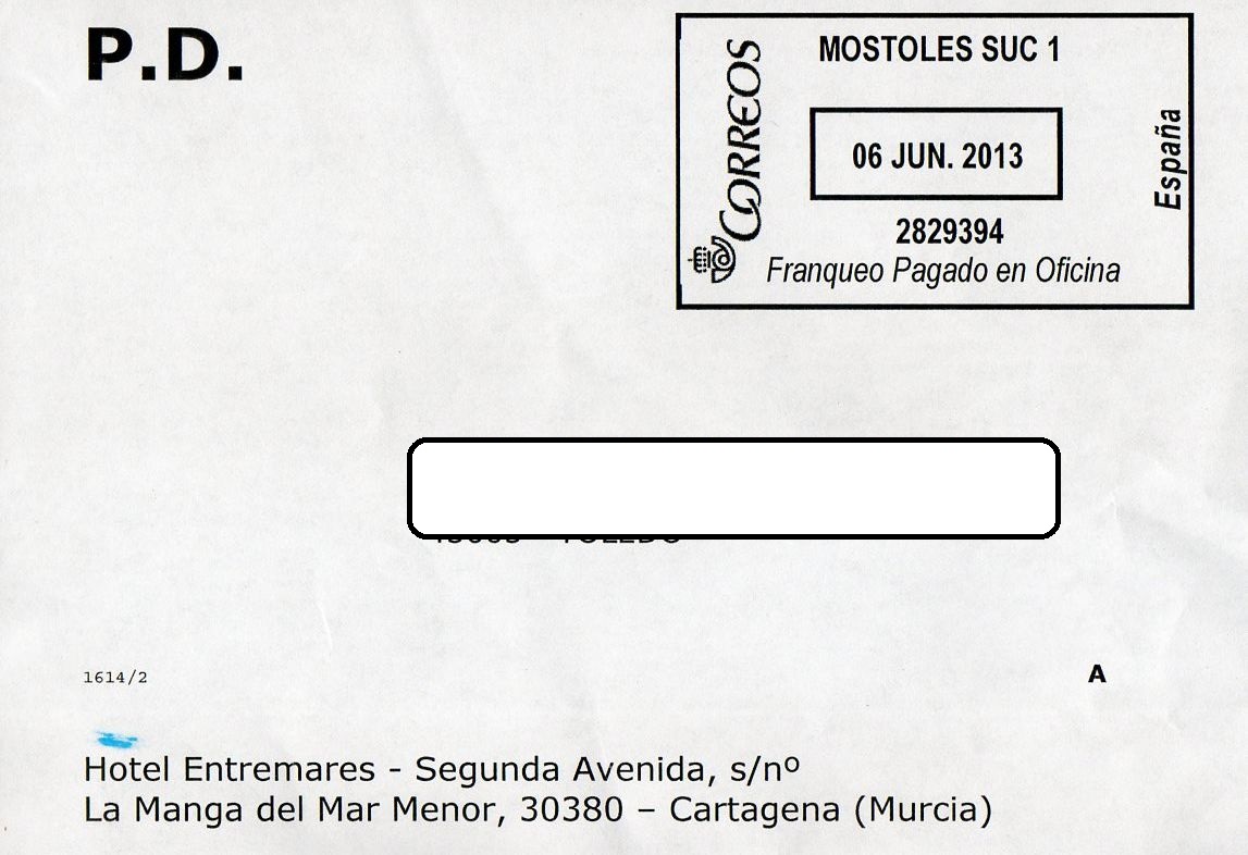 Y termino con una marca que lo mismo pudiera ser de Franque Pagado en Oficina (aunque no consta en la leyenda) o un Franqueo Mecánico. No lleva sellos de franqueo, solo la marca