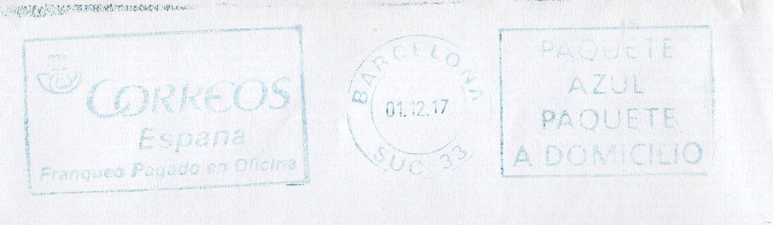 El primero está formado solamente por el rectágulo con CORREOS / ESPAÑA / Franqueo Pagado en Oficina. El remite de la carta es de Barcelona y las medidas 8 x 3,5