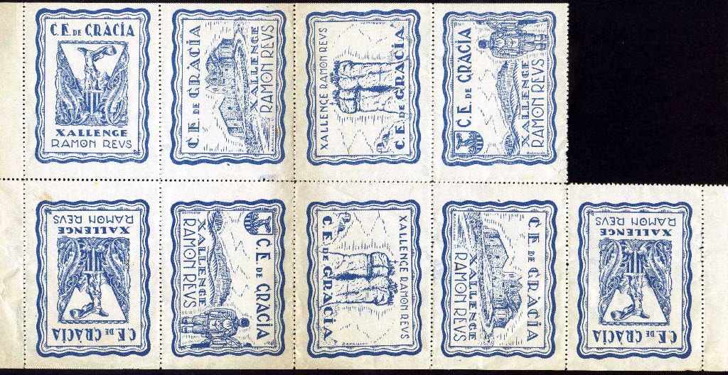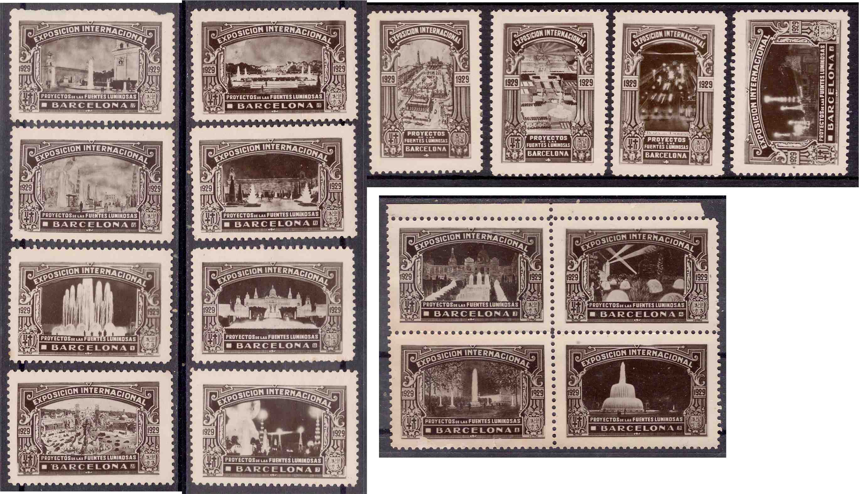Necesito ayuda con ellas, no se cuantas son (tengo solo 16) y desconozco el pliego completo, las horizontales llevan un nº a la derecha de BARCELONA y segun el bloque de 4, van correlativas,,, siendo el mas alto de las que tengo el nº 21, por lo que podría tratarse de un pliego de 6 x 4. Aparte las tres verticales no llevan nº. Como curiosidad también,, el papel del bloque de 4 es un poco más recio que el resto. Por su estilo y morfología estarán impresas por Rieusset SA.