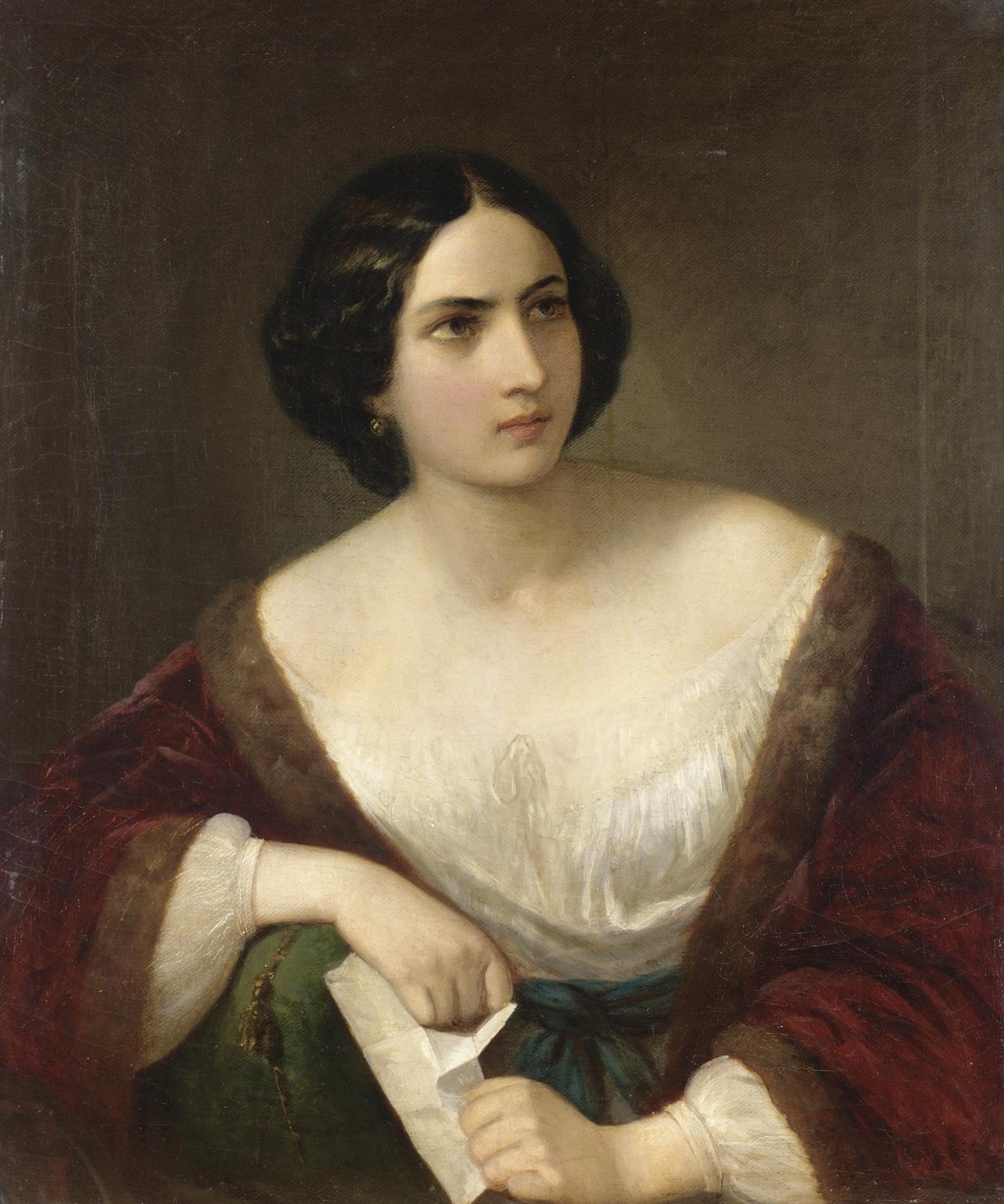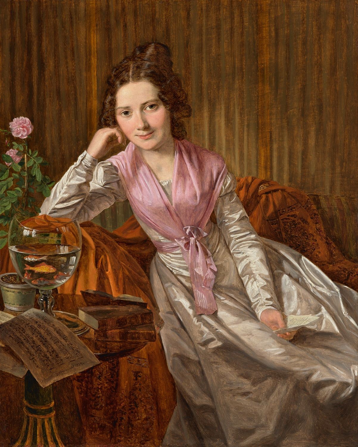 Su virtuosismo no admite discusión, como podemos ver en este retrato de la actriz Therese Krones (1801-1830), que Waldmüller terminó en 1824. Es una pintura elegante y bella, en la que esta joven mujer aparece rodeada de su sencillo y misterioso mundo, con una partitura sobre la mesa, al lado de unos libros, una pecera y una maceta, y con una cartita en la mano que reposa sobre su regazo...