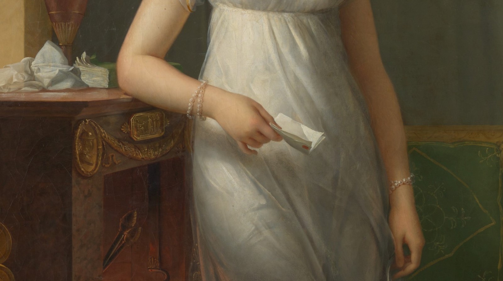 Lo hacemos además con un extraordinario retrato, de gran tamaño y realizado en la misma época (1805) en el que creó otra de sus obras más conocidas, una melancólica indagación en la belleza de la famosa Juliette Récamier. El retrato que mostramos como ambrosía postal es el dedicado a Madame Charles-Maurice de Talleyrand-Périgord, después princesa de Benevento, y donde podemos ver cómo esta dama agraciada tiene en una de sus manos una deliciosa carta lacrada, suave y delicadamente cogida...