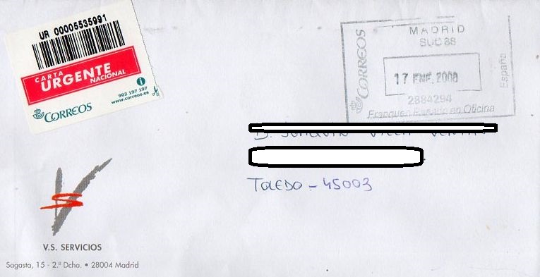 AF-103 MADRID / SUC 88 / 2884294 / 17-01-2008 La etiqueta de urgente está bien consignada: en el alguno superior izquierda del anverso del envio. Pero al darle la vuelta al sobre...veo el comprobante actuando como cierre y además no coincide con el código numérico para consultar la entrega