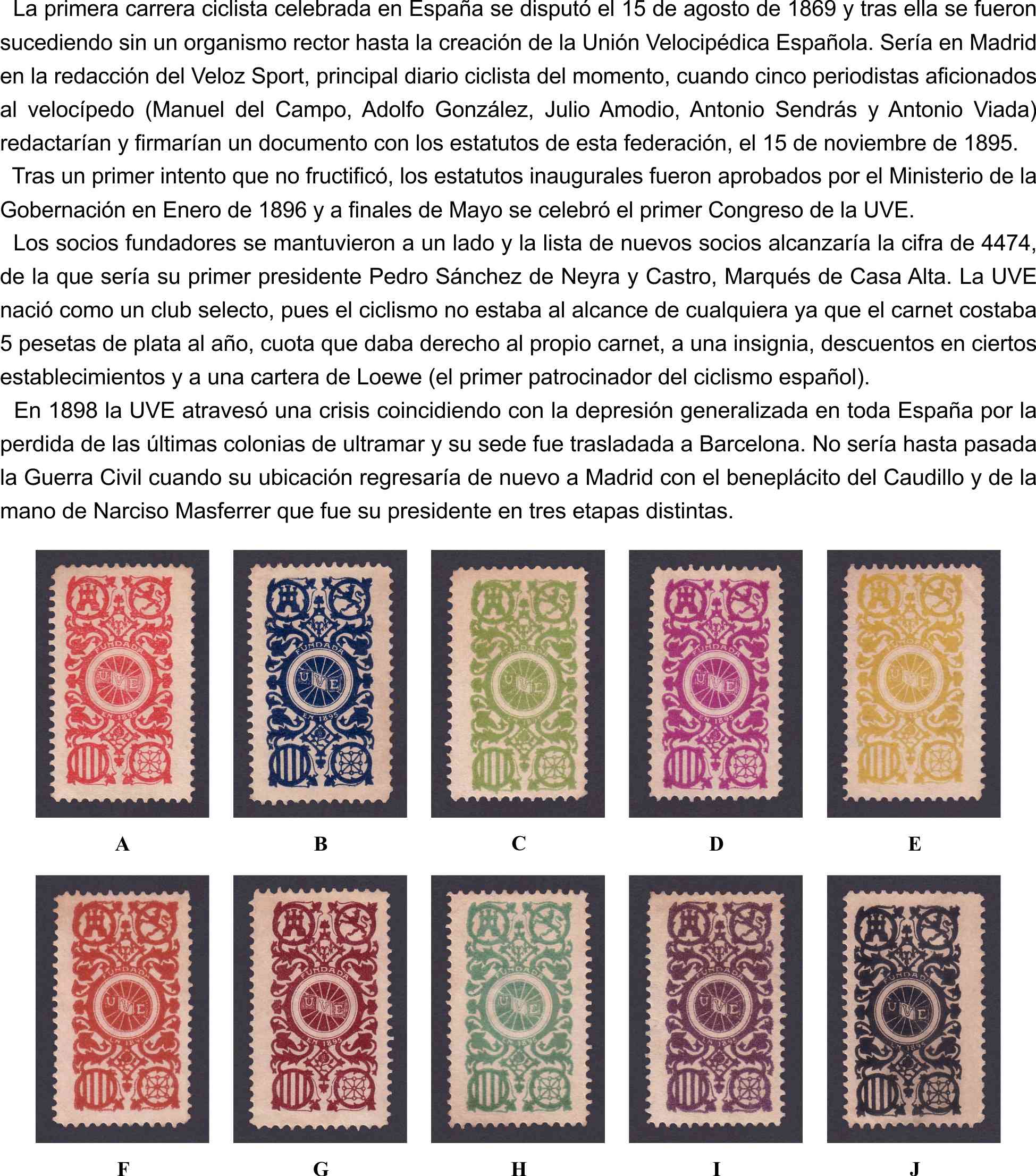 En 1895 se fundó en Madrid, con sede social en la calle Libertad, 6, la Unión Velocipédica Española (UVE), tras la crisis del 98 se trasladó a Barcelona situando la sede en la calle Provença 304.