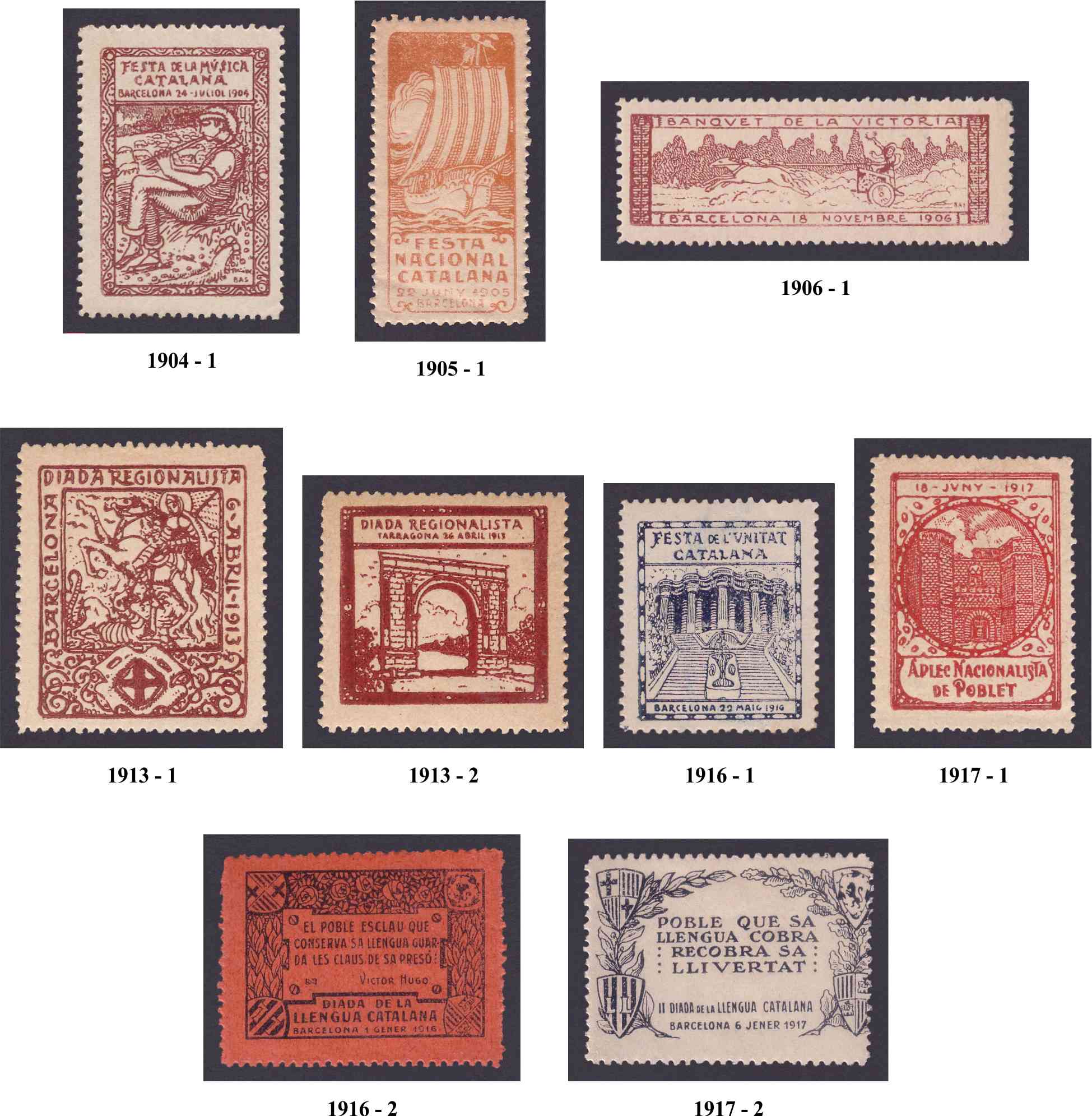 En las décadas de 1900-1920 se editaron un sinfín de viñetas que aunque pueden considerarse de ambito nacionalista, yo prefiero catalogarlas temáticamente en ámbito cultural por celebraciones, personajes, etc. Todas ellas, como era costumbre suelen encontrarse en dos, cinco o más colores y también sobre varios tipos de papel coloreado, una locura intentar recojer todo lo que llegó a hacerse,,,,, y a día de hoy, en general de categoría RRR, solamente localizables en colecciones muy avanzadas por su rareza y escasez.