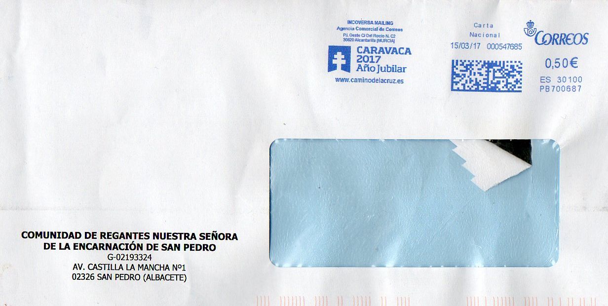 Ambos sobres están franqueados con sellos. La tarifa aplicada, de "Prensa. Publicación de contenido especial, remitida por su editora", dado el peso, era de 0,51 euros.