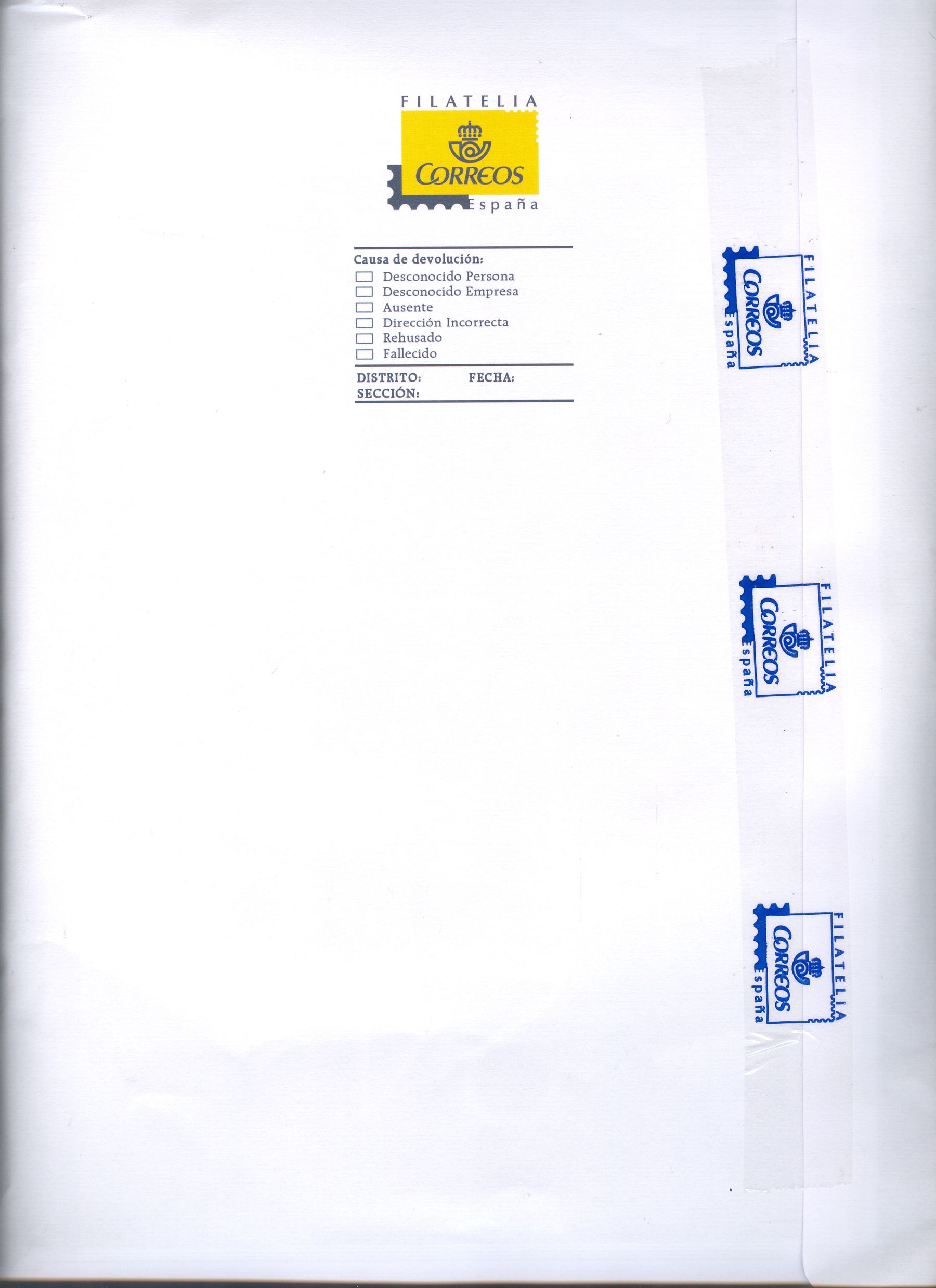 Es de destacar que, si bien el sobre es vertical, el cierre del mismo es lateral y que, para reforzarlo en esta ocasión, han puesto cinta celo transparente del propio Servicio Filatélico.