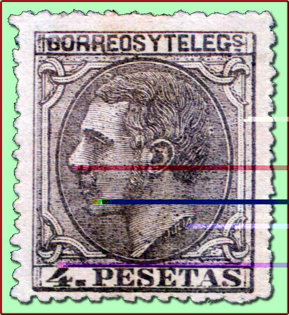 Aquí subo un primo (primastro mejor sería) del valor de 4Ptas. con parecida variedad de "BORREOS" ... fruto de un tintaje "extraviado"