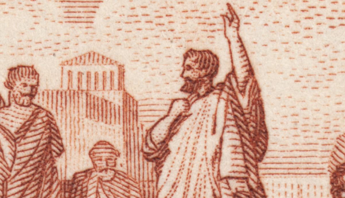 A veces no es necesario inquirir toda la información de un sello. Basta con su poder evocador. Es el caso de este sello griego de la primera mitad del siglo XX. Quizá fuera impreso por una de las casas inglesas de grabadores, no tiene mayor importancia el dato, tampoco queremos saber qué quiso representar el grabador, ni si reproduce un óleo colorido, tal vez... Nosotros lo creamos al modo azoriniano. Estamos en Atenas, año 410 antes de Cristo. La gran ciudad está más cerca de caer derrotada a manos de Esparta. Pero Sócrates, inasequible al desaliento, alecciona a sus seguidores. Habla desde una escalinata del ágora, podemos imaginar a Platón, un joven tímido, allí a la derecha, atento a las palabras del maestro, con el Partenón al fondo....