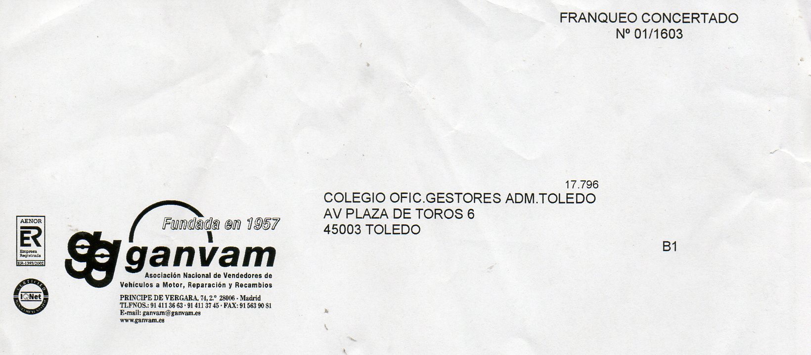 FRANQUEO CONCERTADO Nº 01/1603. ganvam ASOCIACIÓN NACIONAL DE VENDEDORES DE VEHÍCULOS A MOTOR, REPARACIÓN Y RECAMBIOS.