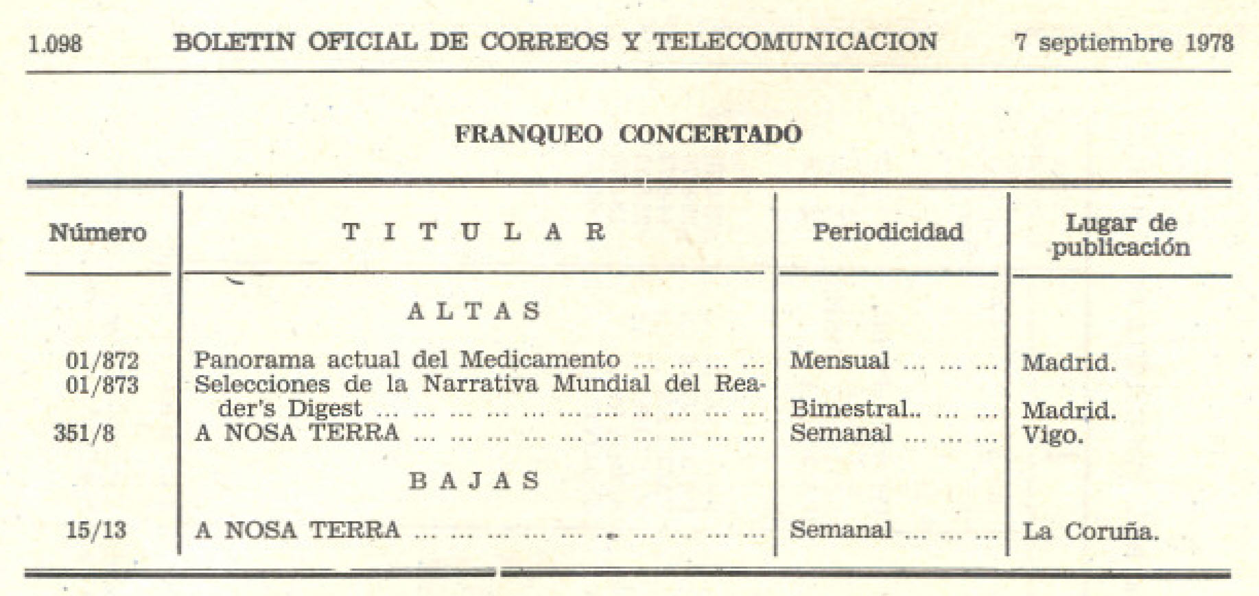 Para que "el santo" se entretenga, muestro en este mensaje un fragmento de la página 1098 del Boletín Oficial de Correos y Telecomunicaciones del 07/09/1978, donde aparecen los movimientos de altas y bajas del servicio de Franqueo Concertado.