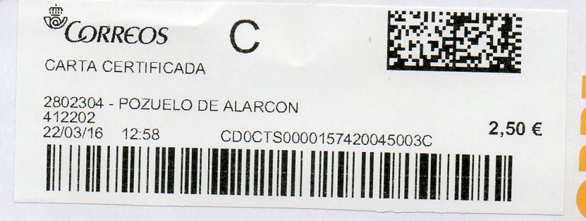 2802304-POZUELO DE ALARCON / CARTA CERTIFICADA / 22-03-16.