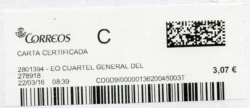 2801394-EO CUARTEL GENERAL DEL EJERCITO DE TIERRA / CARTA CERTIFICADA / 22/03/16.