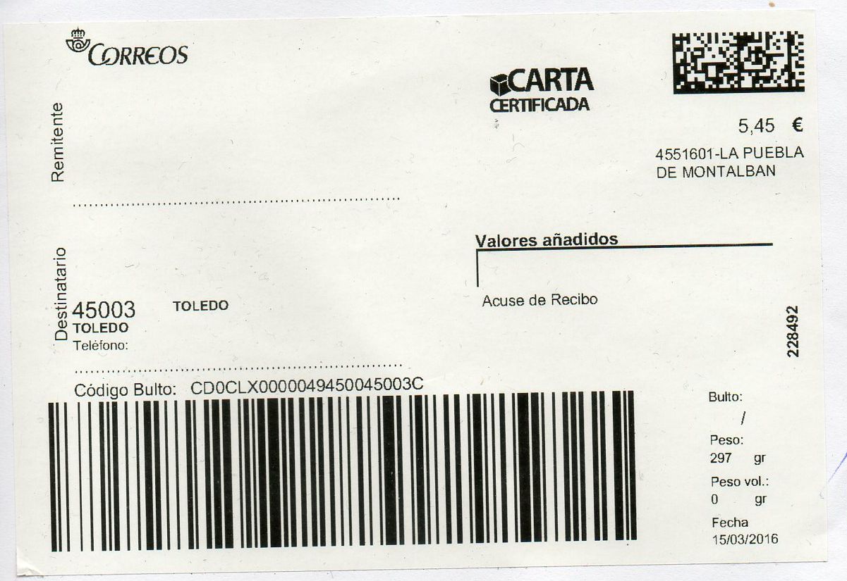 4551601-LA PUEBLA DE MONTALBAN / CARTA CERTIFICADA / 15-03-16. Etiqueta grande.