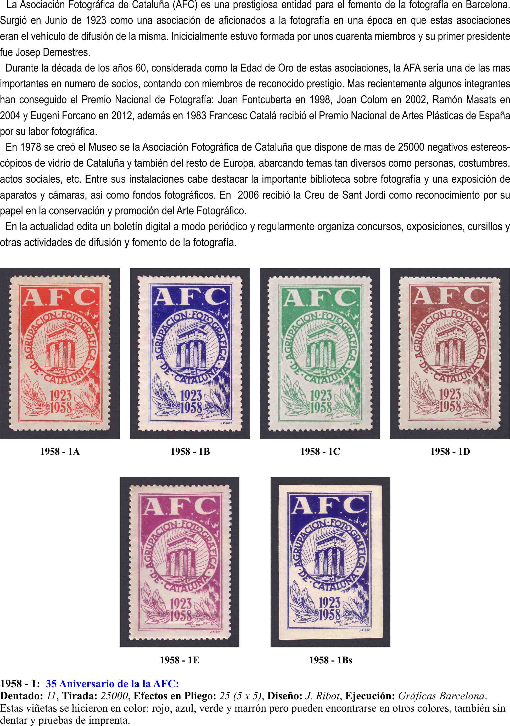 Las del aniversario de la agrupación de fotógrafos, son en cuatro colores, pero se hicieron pruebas en otros,, también existen sin dentar.