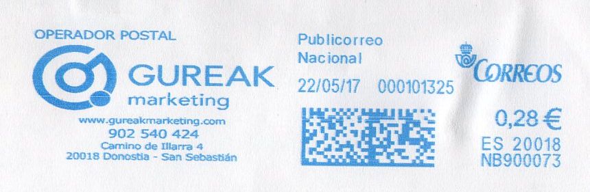 Una de la marca Bowe de alta capacidad del operador postal GUREAK / DONOSTIA-SAN SEBASTIAN y que el preciso catalogo del santo(el segundo) aparece como máquina que se dio de baja y que Evaristo, utilizando las fuentes de Correos, la da de alta el 28 de febrero del 2017 :roll: NB900073