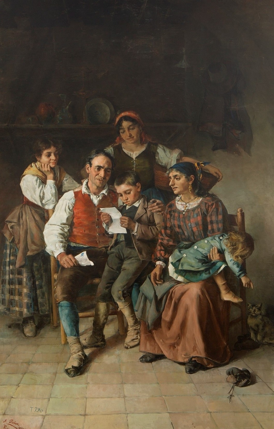 Un artista español inédito en esta nuestra galería de ambrosías postales, el soriano Maximino Peña Muñoz (1863-1940). Según consta en la ficha técnica del Museo del prado, esta bella y emotiva escena familiar titulada La carta del hijo ausente, fue pintada en Roma durante una estancia breve de Peña Muñoz en la capital italiana.