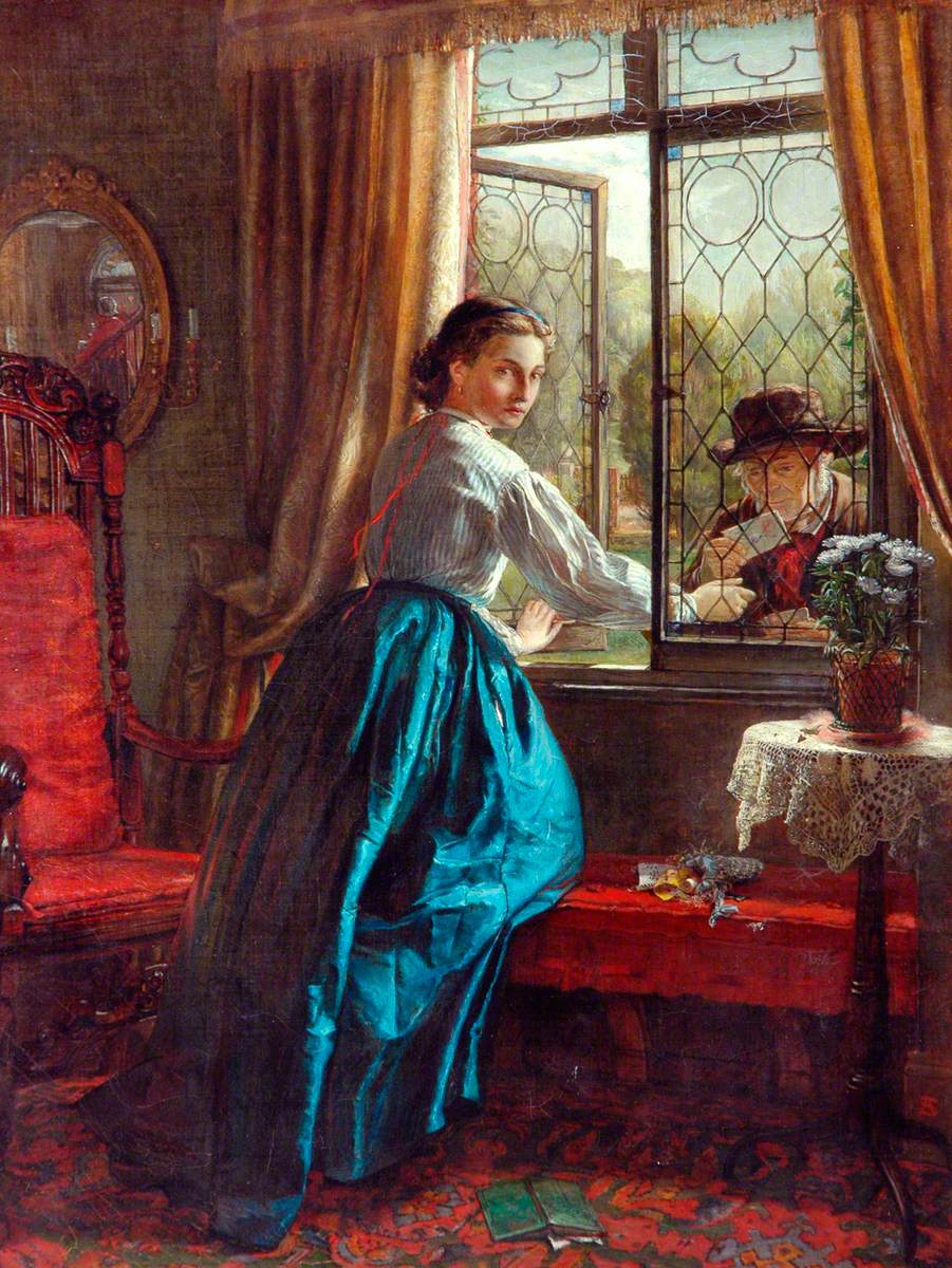 Y esta obra del artista británico Arthur Stocks (1846–1889) es una ambrosía postal muy colmada y pletórica, en la que están presentes el viejo y entrañable cartero, la carta esperada, y la impetuosa y bella destinataria…