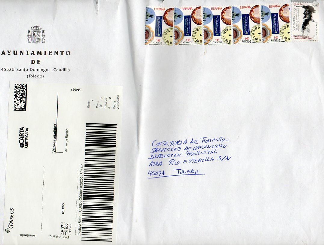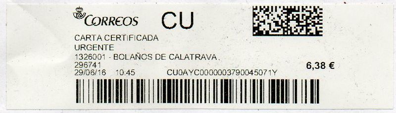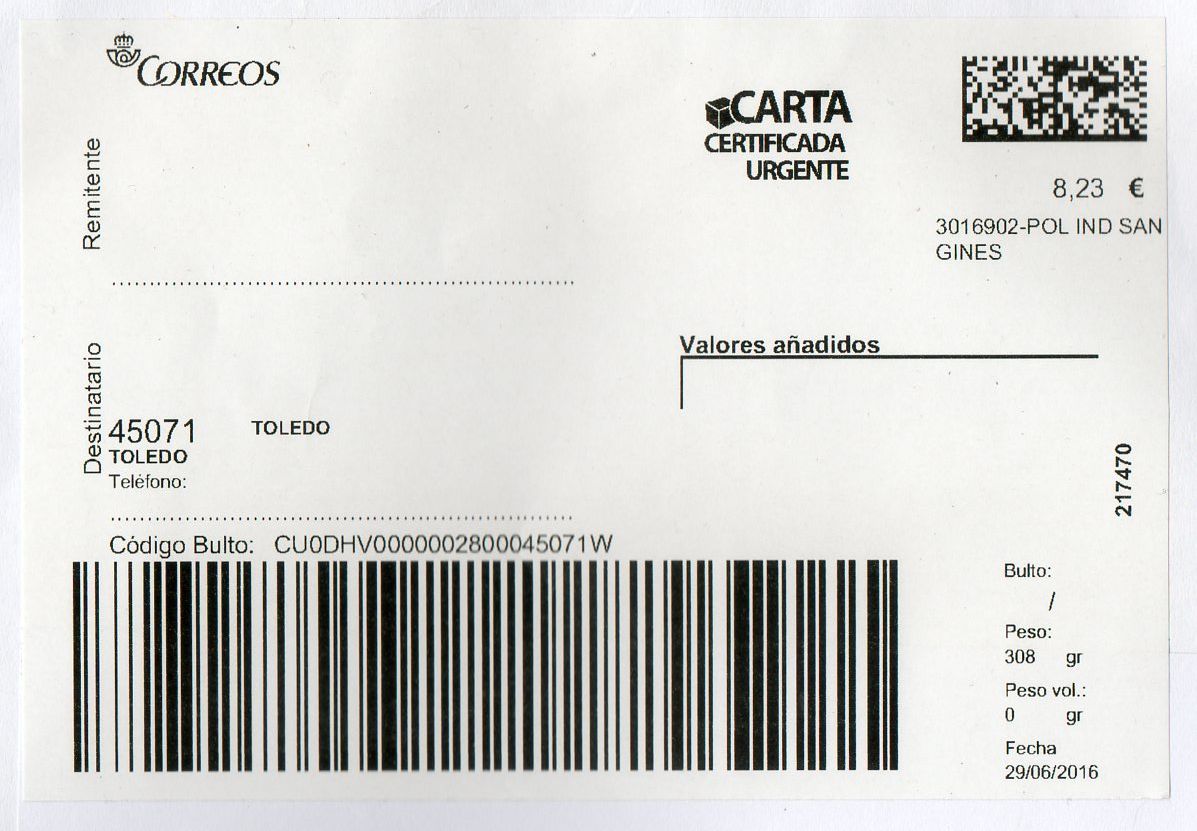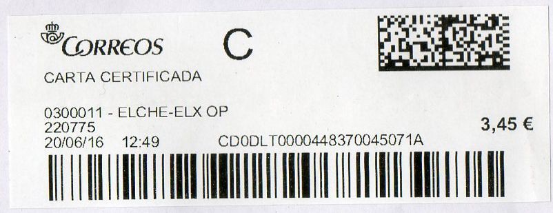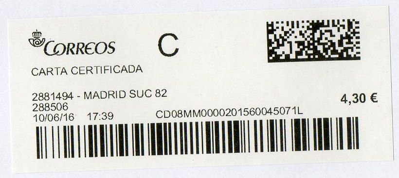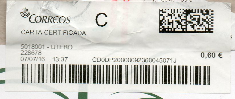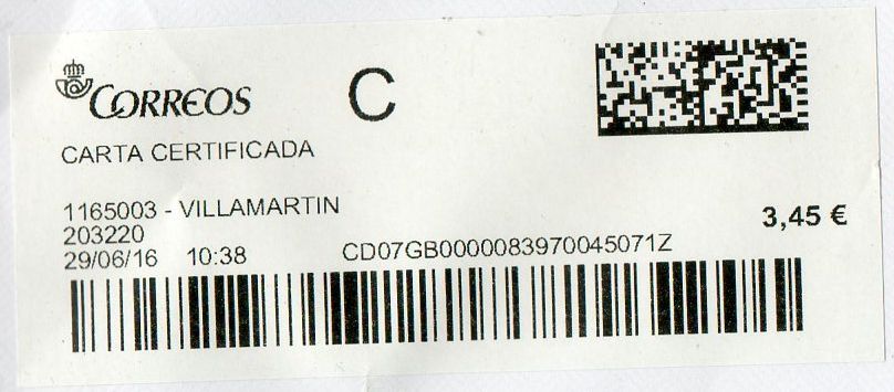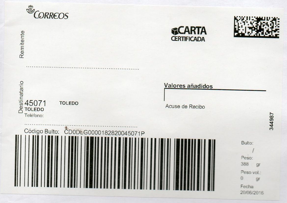 Y el motivo de la existencia de esta etiqueta, grande en lugar de la normal de carta certificada, es debido al peso del envío.