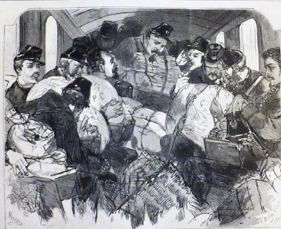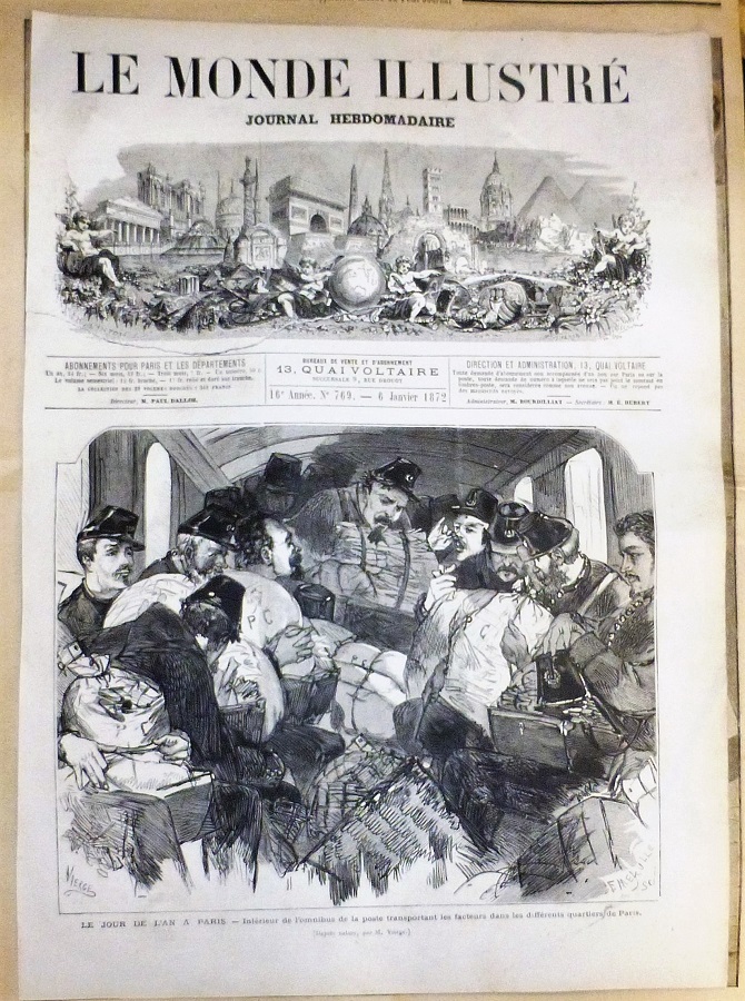 Grabado: Inrériur de l'omnibus de la poste transportant les facteurs les différents quartiers de Paris