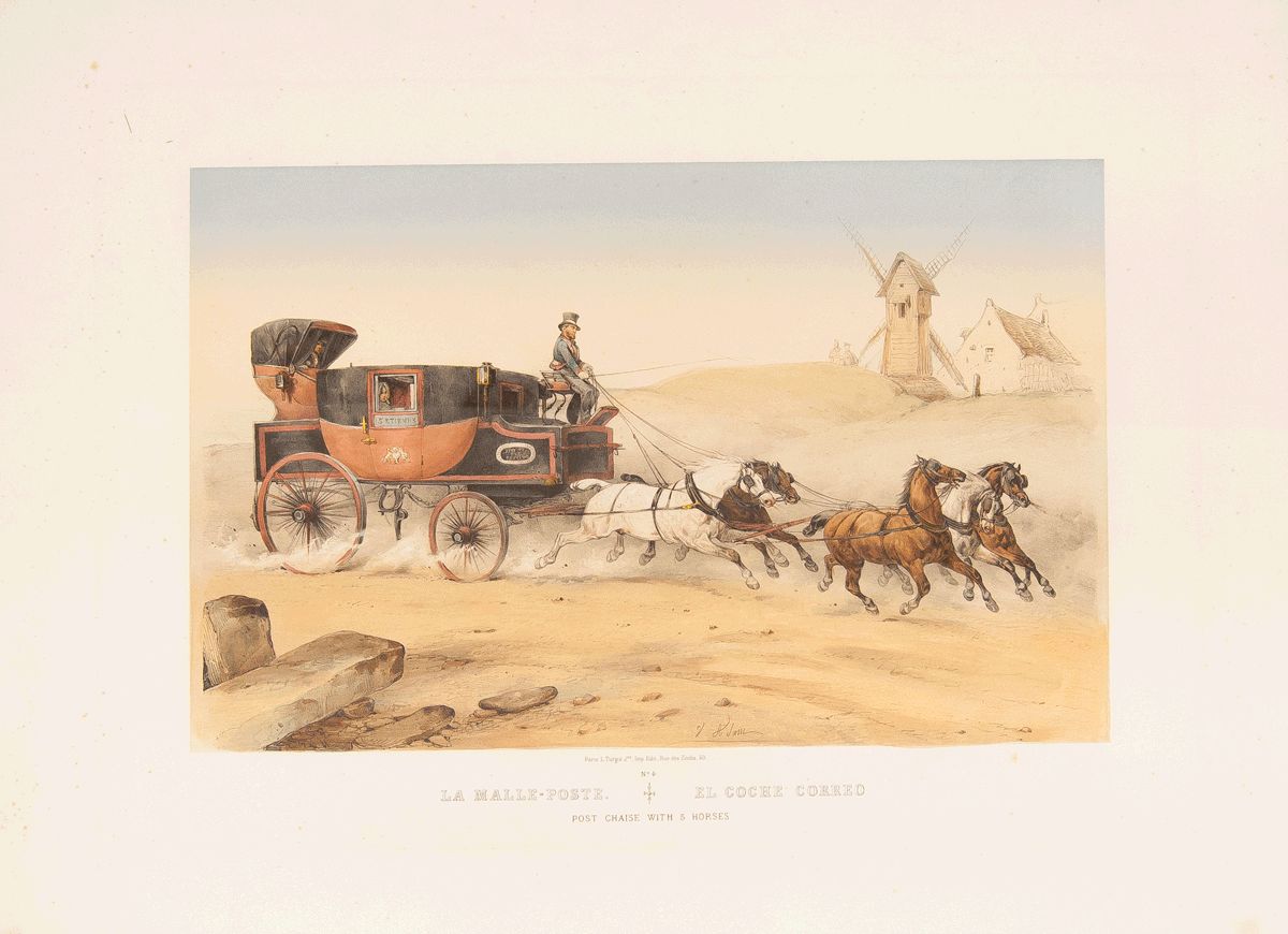1830. LA MALLE-POSTE. POST CHAISE WITH FIVE HORSES (El coche correo con cinco caballos).