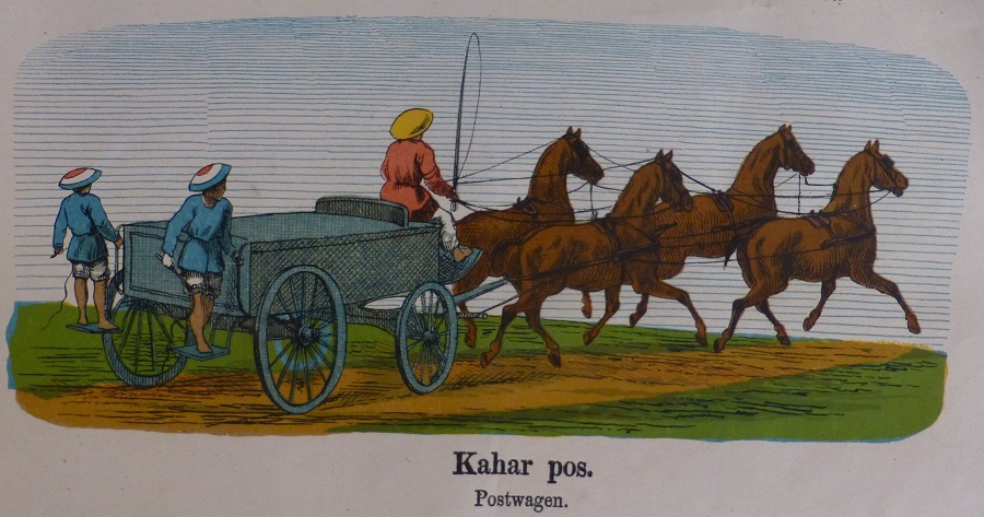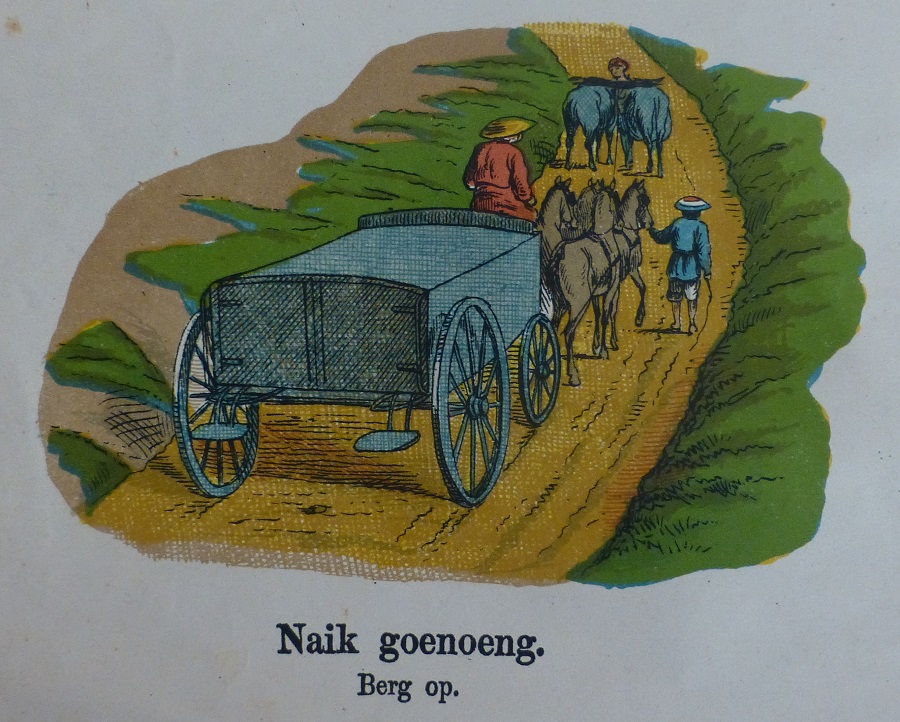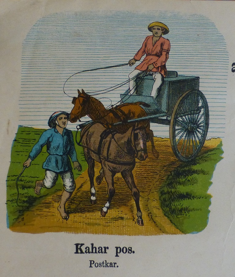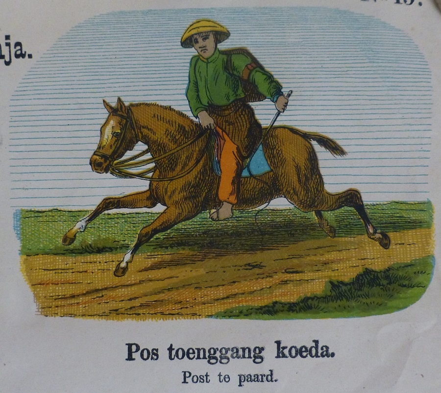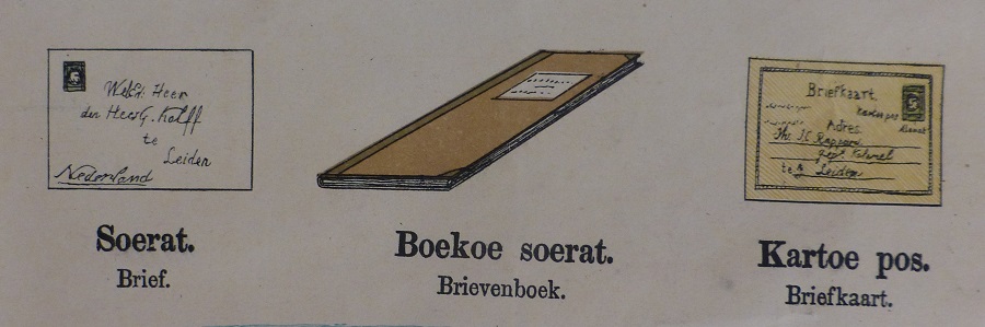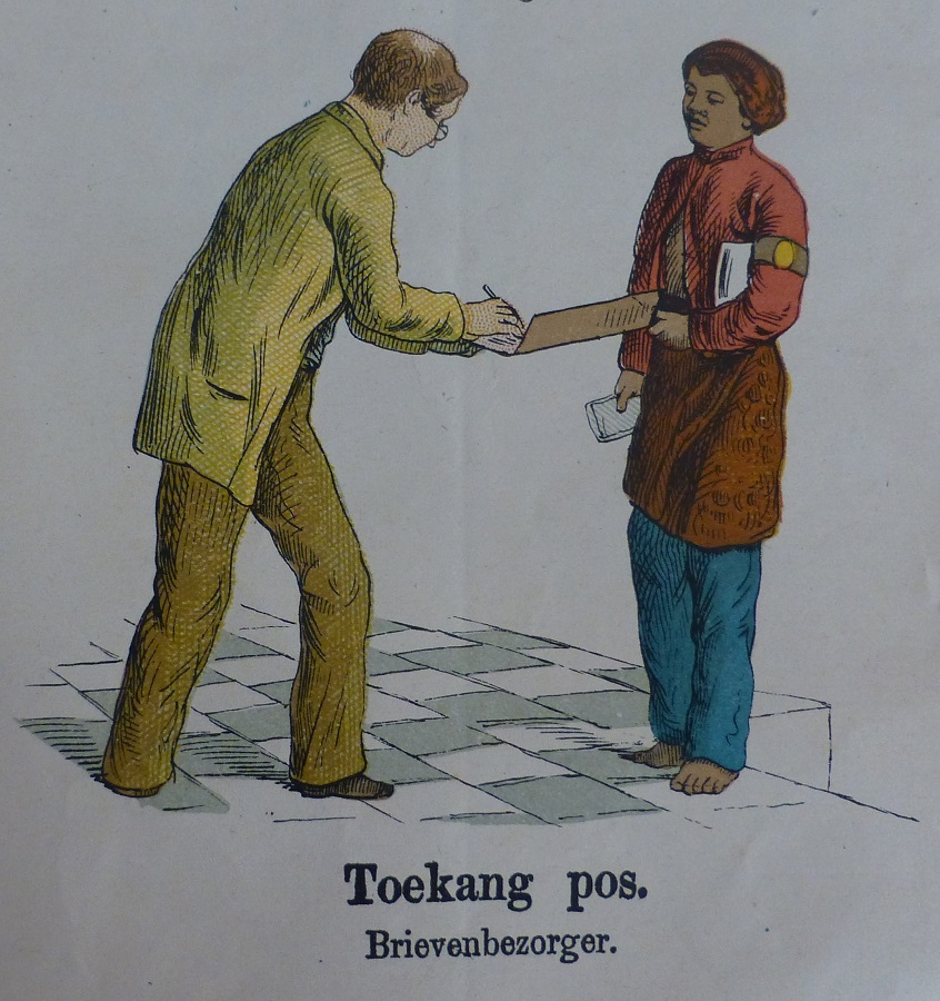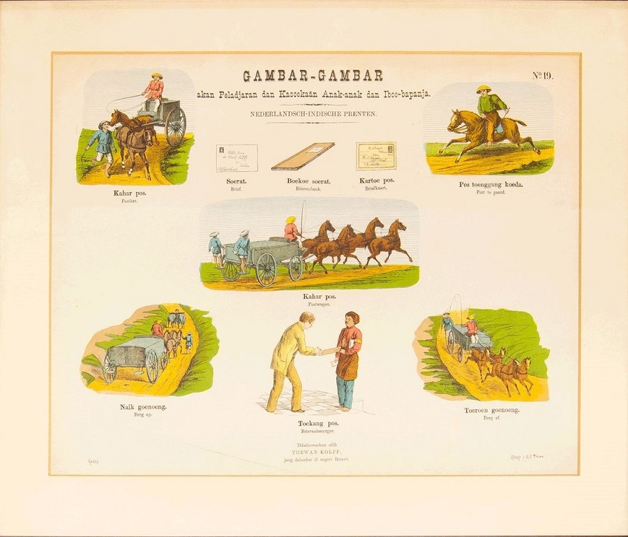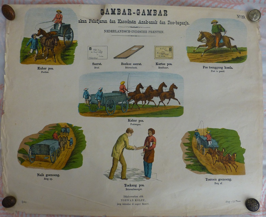 Estampas para la educación de los niños y sus padres. Lámina Nº 19 sobre los correos y con subtitulos en holandés y malayo mostrando la vida social y doméstica de los indonesios y los holandeses, utilizados para enseñar a los niños holandeses el idioma malayo y los niños malayos el holandés, se aprecia la importancia del correo. Litografía en color de GJ Thieme, Batavia (Yakarta).