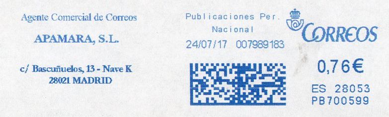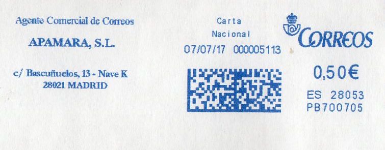 A día 30 de Junio de 2017 la máquina PB700485 de APAMARA, S.L causa baja por reposición...por la máquina PB700705 que lógicamente se da de alta y que el bueno del santo todavía no ha registrado en su magnifico catalogo :mrgreen: (quizás esté en la zanja de las altas y bajas de estas máquinas y la base de datos de Rafa.....puff, creo que Luis necesita unas vacaciones...). Para confirmarlo subo una impronta de esta máquina, probablemente del mismo dia que se dio de alta) con 5113 ítems franqueados, contador bajo si tenemos en cuenta que la hermana PB700704 franqueaba mas de 10.000 improntas al día PB700704:
