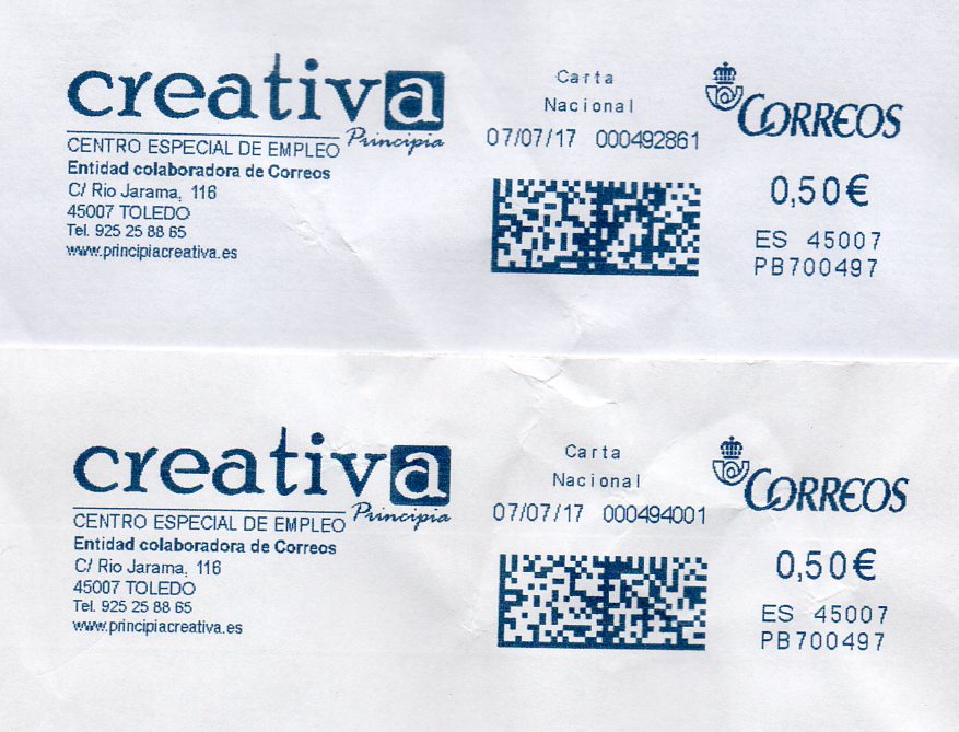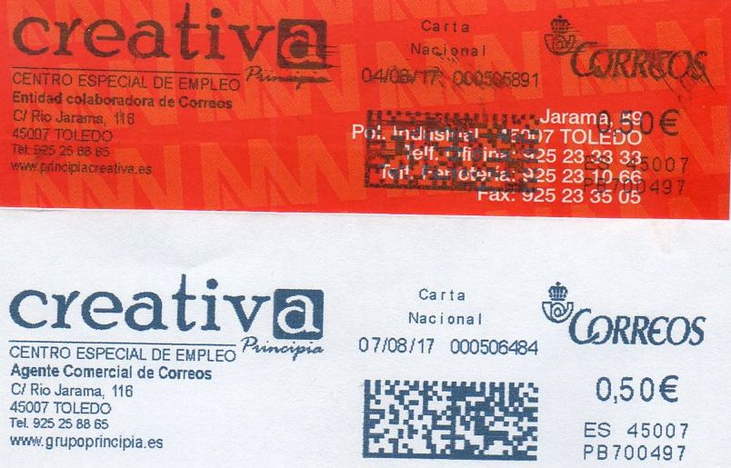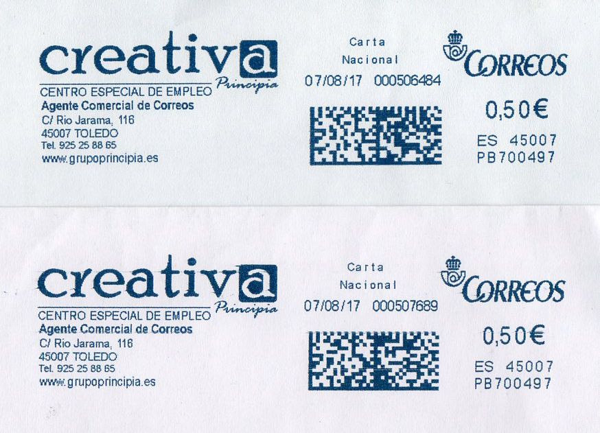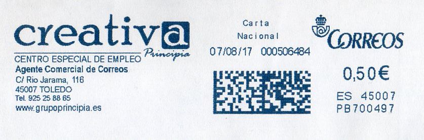 Como todos sabeis soy toledano y domino la impronta CREATIVA que gestiona la correspondencia de muchas empresas del polígono industrial de Toledo.... que saqueo de vez en cuando :mrgreen:. Siempre me ha hecho ilusión tener en mis manos un "SPD" no filatélico de estos franqueos digitales y creo que, por fin, lo he encontrado.....