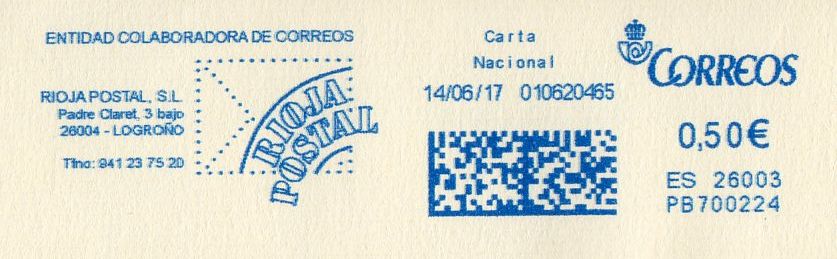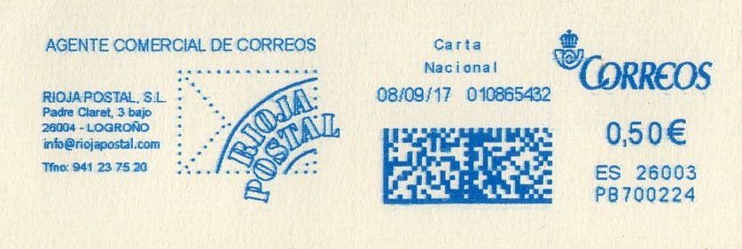 RIOJA POSTAL PB700224 pasa de entidad colaboradora de Correos a AGENTE COMERCIAL. La única novedad en la tarjeta publicitaria es que ya dispone de Web.