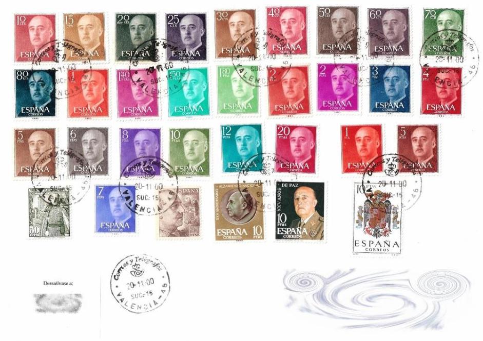 En mis manos hay una carta con la serie básica al completo (incluyendo los pies FNMT-B), con otros valores afines complementando hasta un total de 135 Pts., que en el año 2000 (20-N, 25 aniversario de la muerte del General Franco) correspondía a un envío ordinario superior a 100 grs.