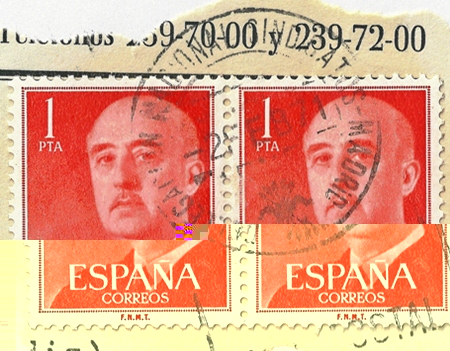 Hace tiempo que vengo siguiendo el hilo sobre esta serie que pertenece al imaginario personal de los que ya no volveremos a cumplir los 50 tacos de almanaque.Hemos crecido viendo en la casa familiar,en la de tus parientes y amigos, cartas,tarjetas,paquetes franqueados con "los sellos de Franco" ¡tantos años presentes en las escenas cotidianas de nuestra infancia ! . Creo que ahí empezó todo. Y de mi pequeña colección de fragmentos y sobres franqueados con los "sellos de Franco" os iré subiendo ,poco a poco, una selección de alguna de las piezas que me parecen más interesantes. Ahí van las dos primeras :