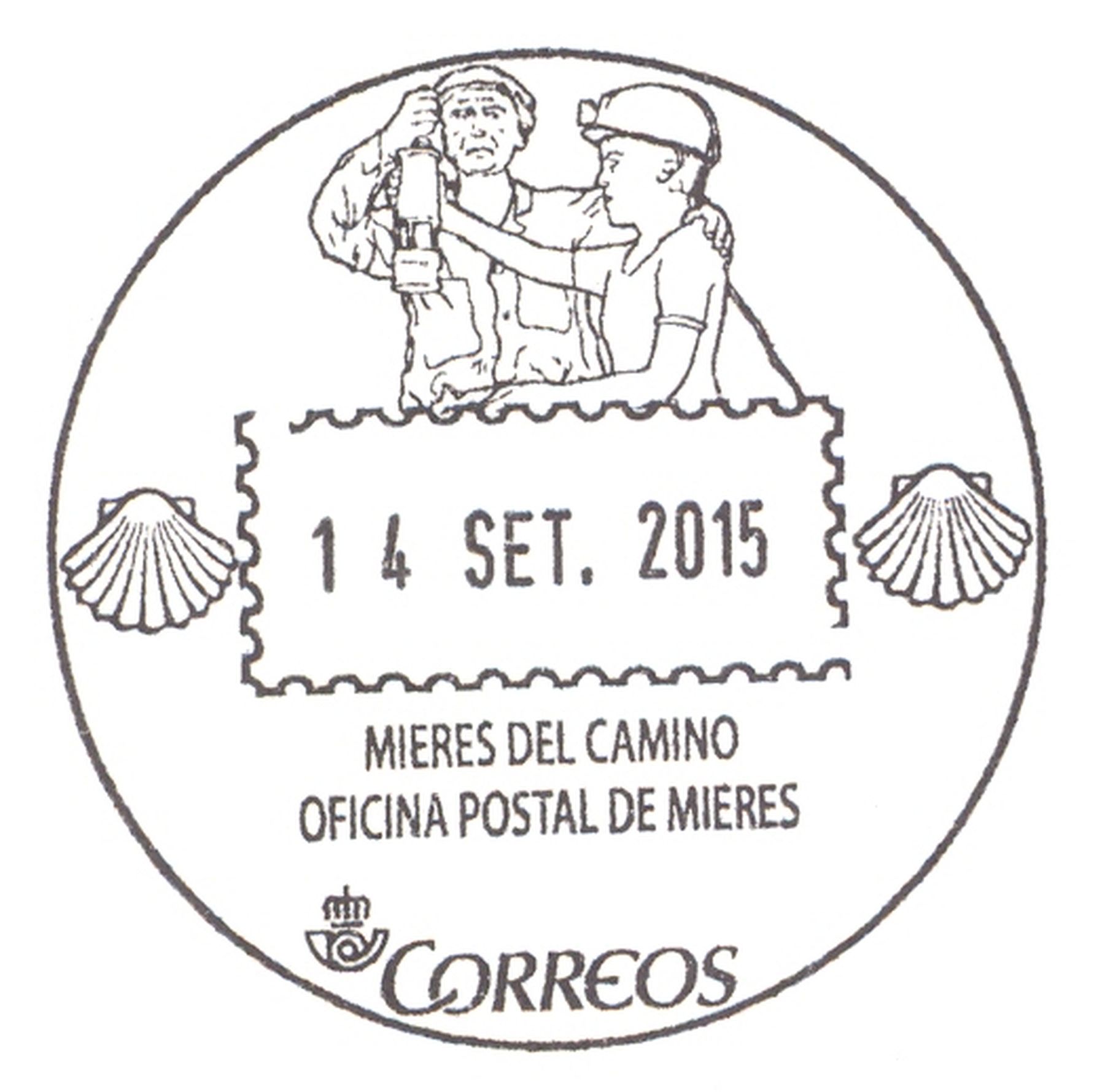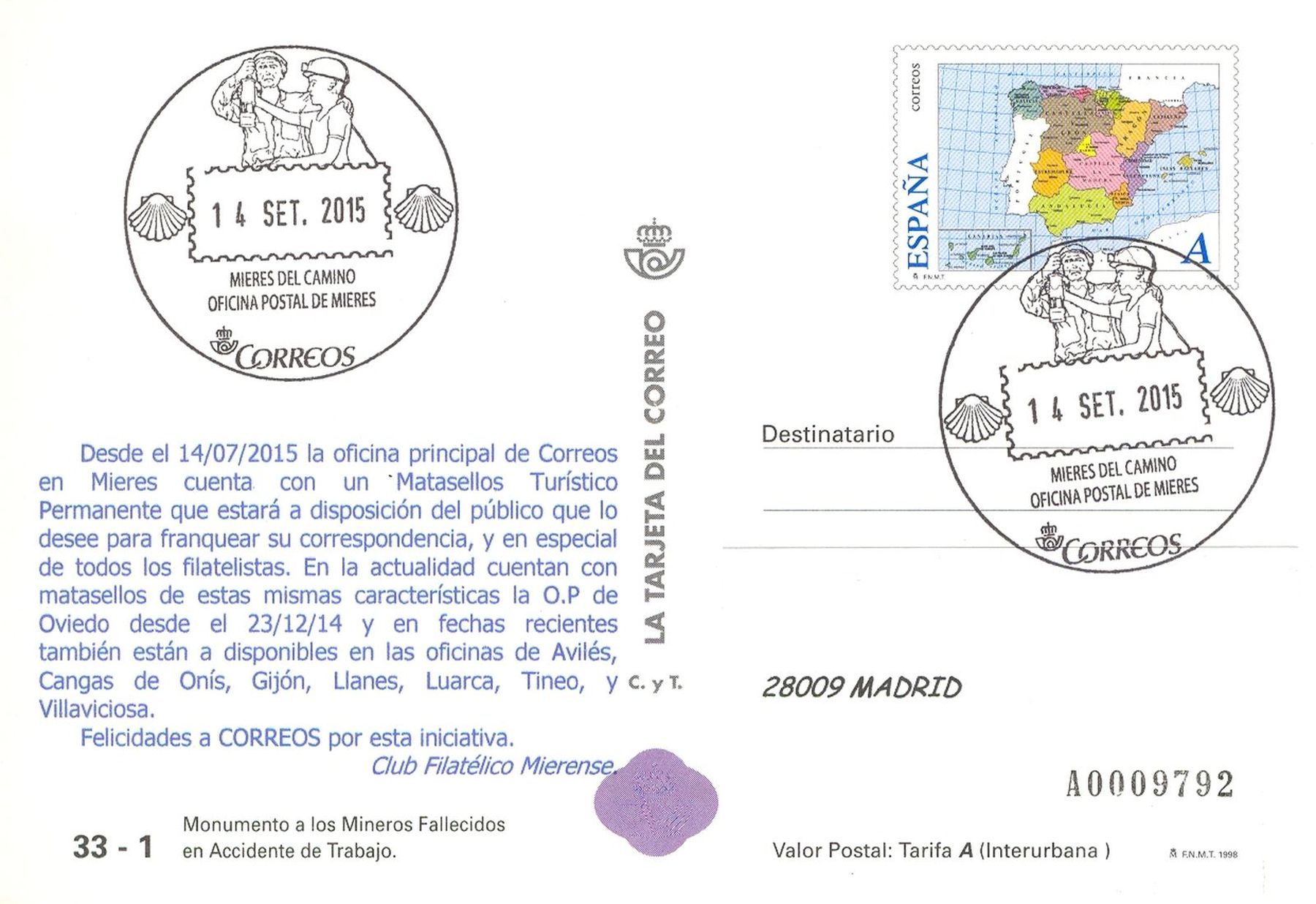 Para ello, ha utilizado "La Tarjeta del Correo" 33-1, dedicada al "Monumento a los Mineros Fallecidos en Accidentes de Trabajo" ubicado, precisamente en Mieres del Camino y que se editó en el año 1998, con Tarifa A que siempre es válida, ha escrito con el ordenador el texto que se deseaba comunicar, dejando un cuidadoso espacio en la arte superior del mismo para recoger el refrendo del matasellado y han llevado las tarjetas a la oficina de Correos para que fuesen mataselladas con el matasellos turístico (o postal) de Mieres del Camino. Con fecha del 14 de septiembre del año 2015, justo dos meses después de su puesta en funcionamiento.