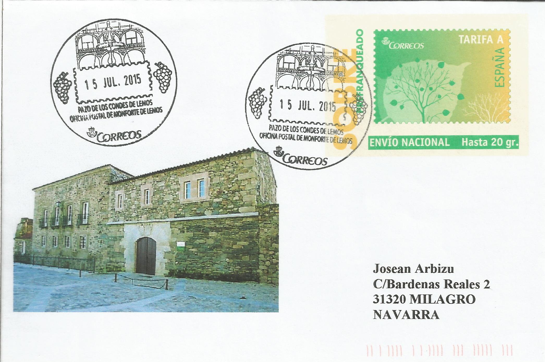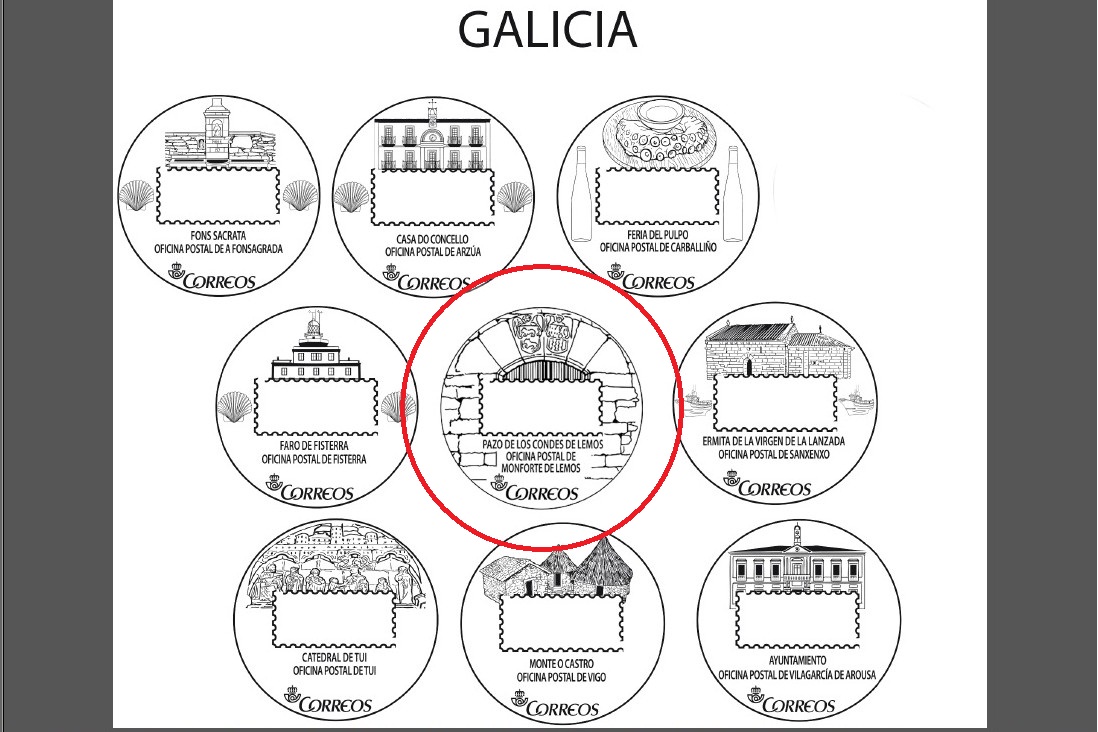 Veo que en la relación de los matasellos postales ya publicados con toda su información, imagen y donde puede conseguirse, el dibujo de la Oficina Postal de Monforte de Lemos y motivo Pazo de los Condes de Lemos es este...