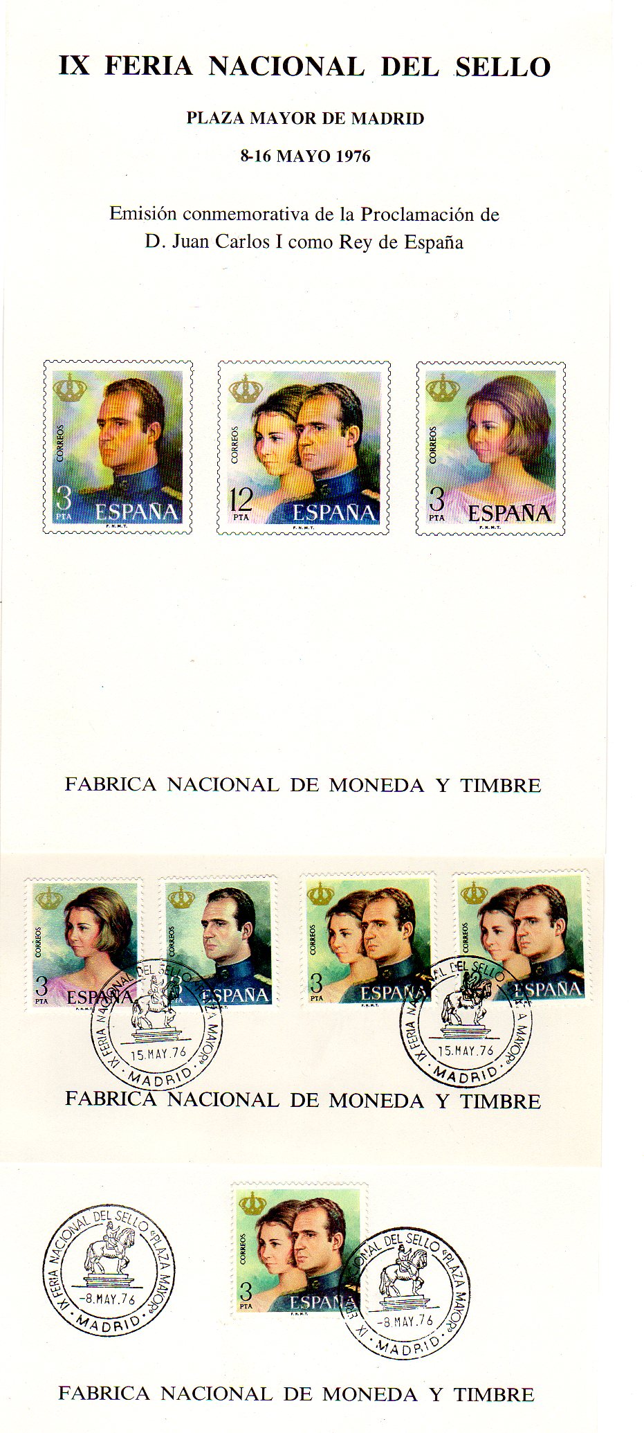 Tres tarjetas IX Feria Nacional del Sello Emisión Conmemorativa Proclamación D. Juan Carlos I Rey de España