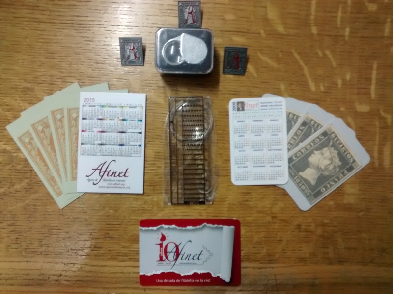kit filatélico compuesto por lupas , odontómetros, pines afinet y calendarios ( el calendario es para que los filatelicos sepan en que dia viven después de estar horas sumergidos en la colección..)