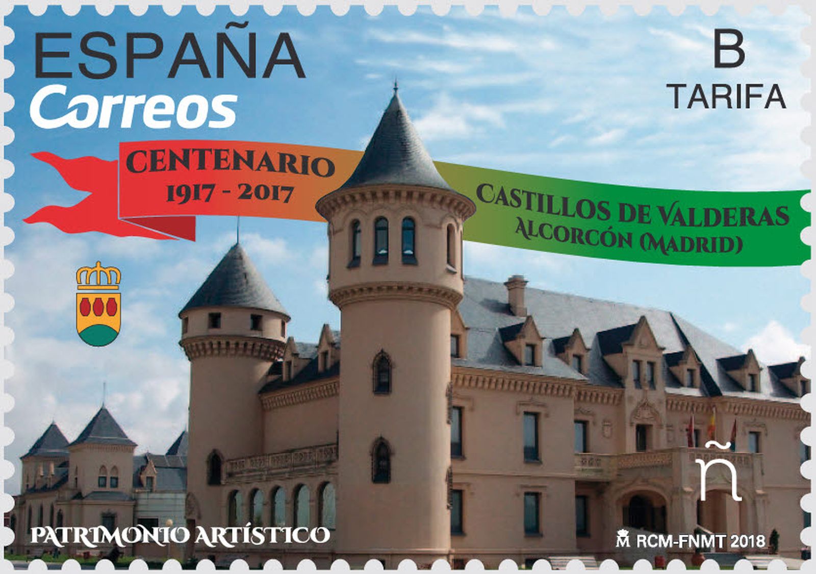 Hoy, día 10 de abril de 2018, dentro de la serie denominada «Patrimonio Artístico», se emitirá un sello de correo autoadhesivo dedicado al «Centenario de los Castillos de Valderas 1917-2017, Alcorcón (Madrid)».