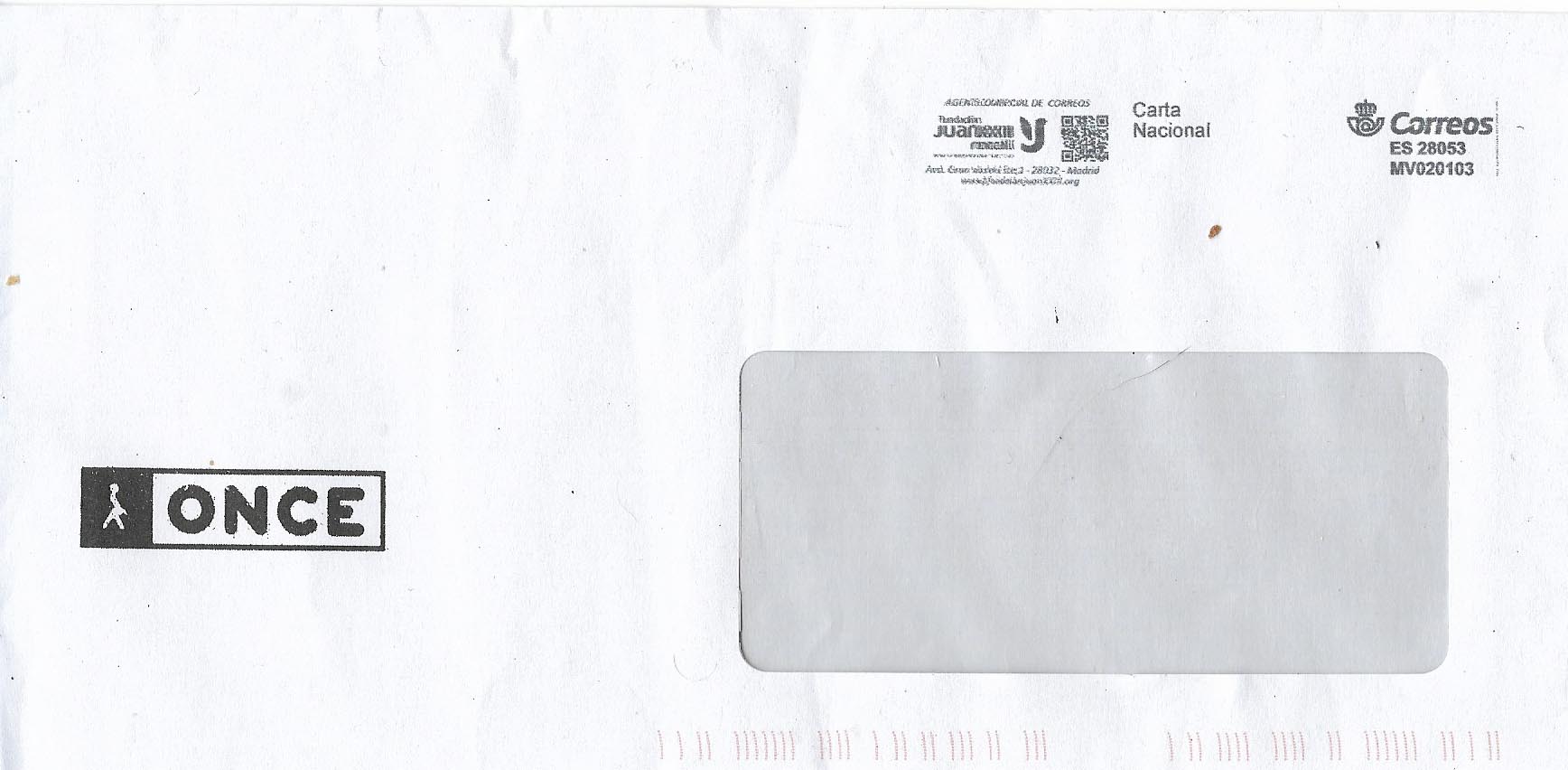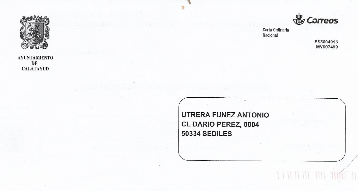 Adjunto dos sobres, el primero del Ayuntamiento de Calatayud y el segundo de la ONCE. A quién pertenece el segundo está claro: Agencia Colaboradora de Correos Fundación Juan XIII, que es la que presta sus servicios a la Organización de Ciegos. No tan claro está la primera, la del Ayuntamiento de Calatayud.