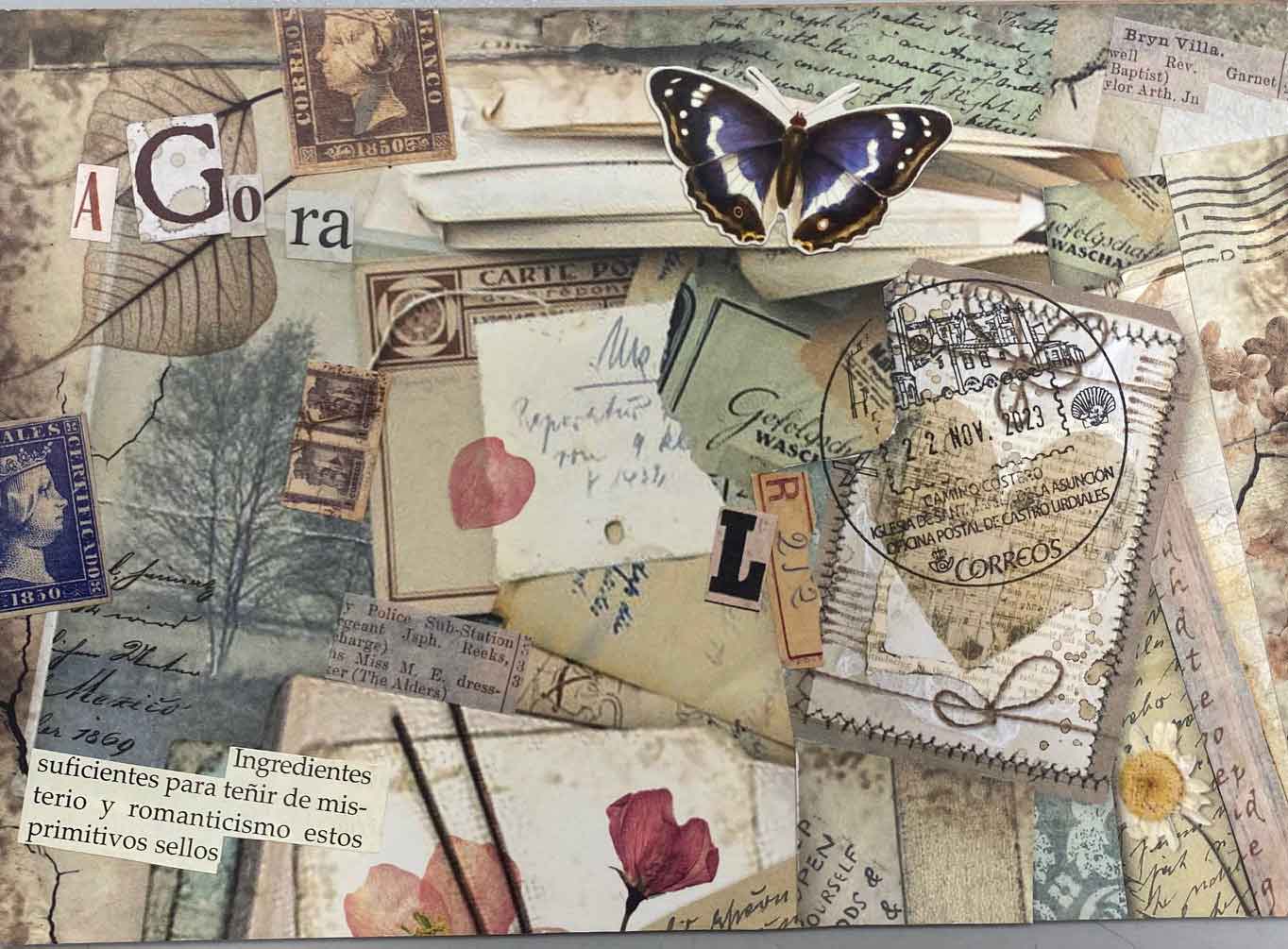 Y la segunda serie la hice casi igual, con los mismos materiales, añadiendo incluso algunos de los que os he mandado, como un fragmento de un diccionario y una pegatina de texto antiguo y otra pegatina con mariposas o cosas así. Esto está entre lo que os he enviado y me quedó esto que le mandé a Charlie (entonces estábamos en el Club solo Charlie y yo):