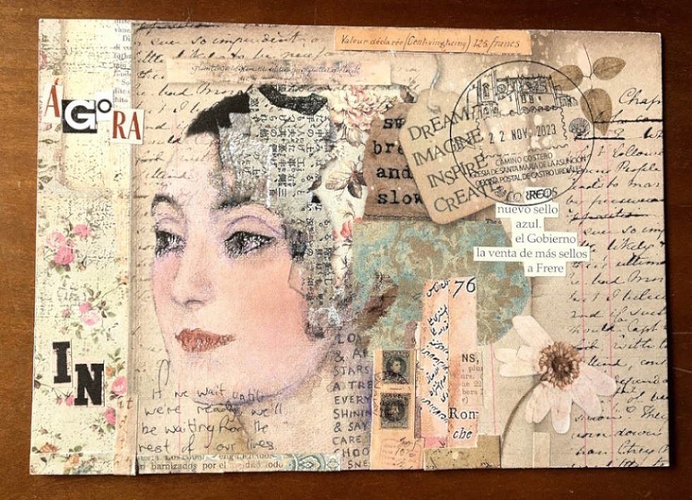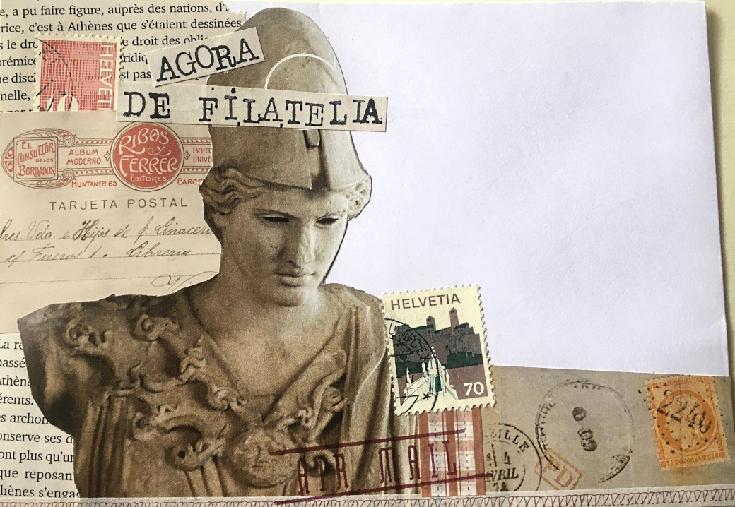 Como podéis ver, esta pieza no lleva más que dos recortes de unas imágenes de cartas de un viejo catálogo, un par de recortes de textos en francés sobre la filosofía griega, el recorte de la silueta de una estatua griega de la misma revista que los textos, un par de sellos purriosos de Helvetia y un par de cachitos de washi tape (celo decorado). Nada más. Y todo puesto de un modo que tampoco hace falta seleccionar; se pegan los recortes casi al azar, cómo queden y ya está.
