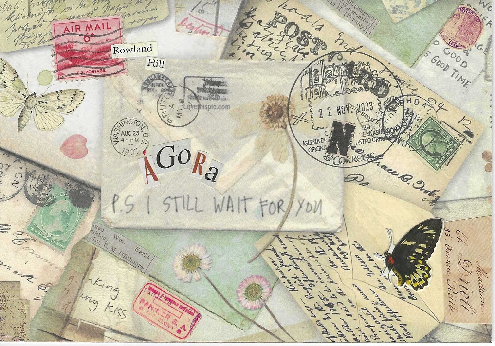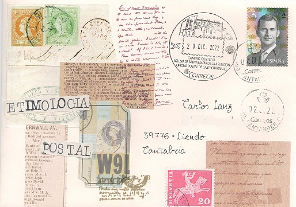 Os muestro una composición, que no sabría como llamar. Hay corta y pega, por lo que scrapbooking creo que sí tenemos. Usé recortes de copias (no son originales) de sellos del siglo XIX, y de cartas antiguas circuladas a tamaño mini. Lo más curioso, y es lo que perseguía es que el matasello es un dibujo mío, alusivo a un aniversario que me toca en lo personal. Había que poner un sello actual tarifa A, para que no fuese rechazado el envío. Lo mejor es que no lo llevaron al CTA, igual ya me conocen y ha llegado así de bien a la destinataria. Otro ejemplo de mis recientes "locuras", por si sirve para animar a alguien.