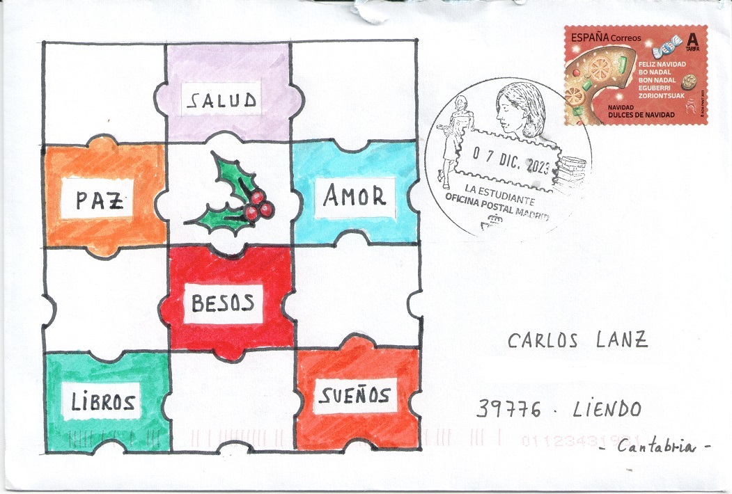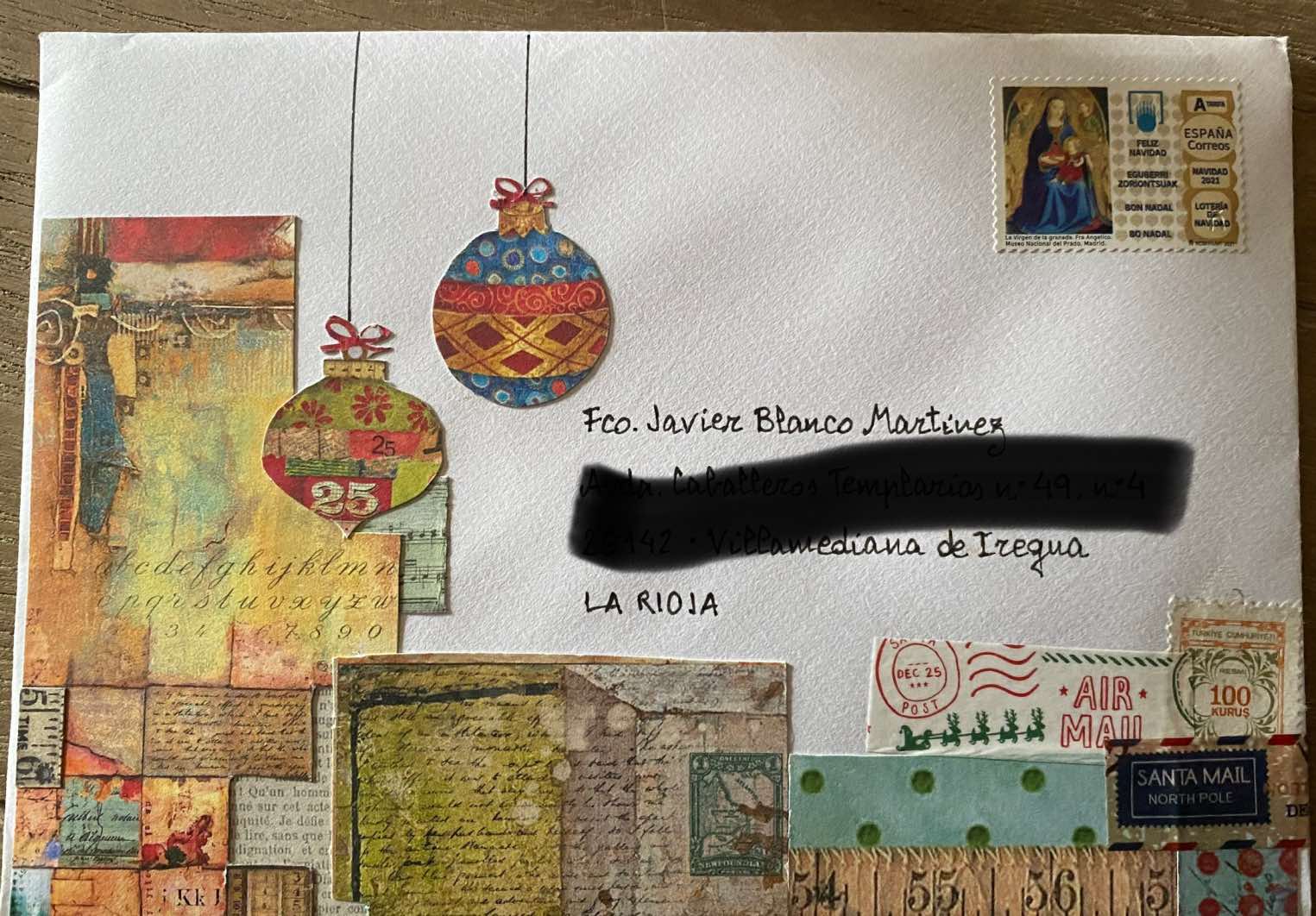 Recibida también por aquí la preciosa carta de José Luis, con bonita e interesante postal navideña artesanal en su interior. Como la mía tiene el mismo dibujo que la mostrada por Carlos, no hace falta que la muestre, aunque lo que sí quiero es constatar lo mismo que dice Carlos, que es un placer ver cómo los compañeros del Club van evolucionando en sus ideas y composiciones. En este caso, me ha encantado tanto la idea como la composición con la que José Luis ha ilustrado el sobre. Y las ideas que nos regalan los compañeros a mí me resultan muy estimulantes, muy sugerentes y me estimulan mucho y aprendo mucho de ellas.