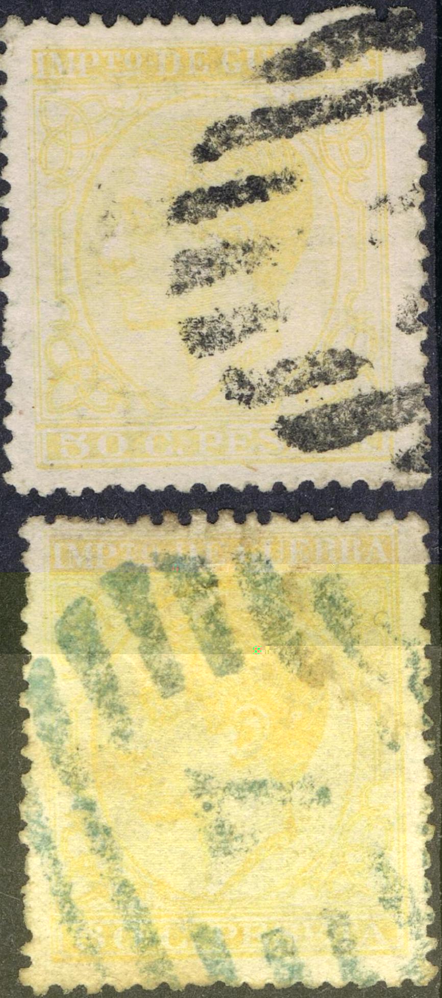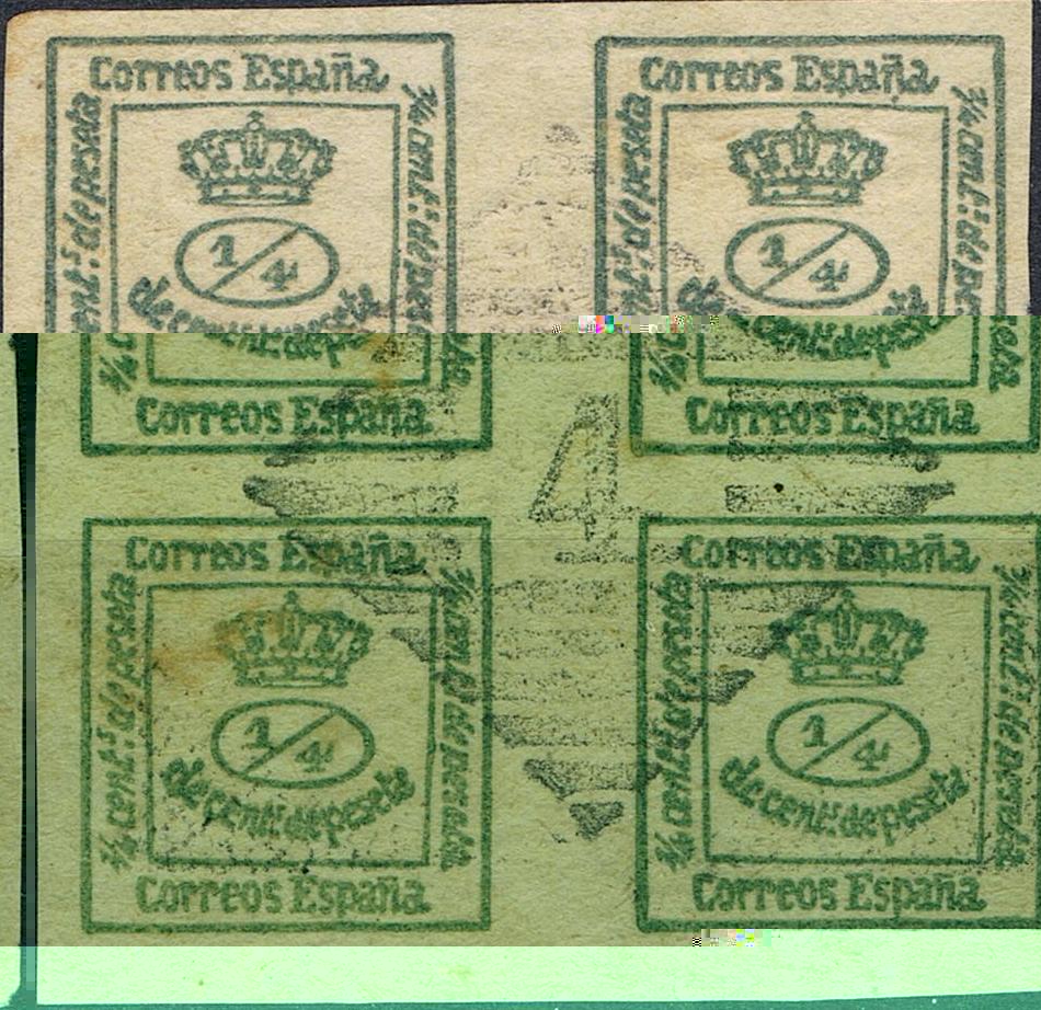 Siempre cabe la posibilidad de que resulte falsa o "póstuma", pero a mi me gustaría poder observarla en "vivo", de todas formas e independientemente de que ya Tort la describiera en ese mismo color y emisión, yo creo tiene las mismas características de diseño que las utilizadas en las emisiones de Isabel/Matrona, subo imágenes de la P. C. 38 con estampaciones claras para que podais comparar diseño, distancia entre líneas etc......... y ya un poco más desgastada en la emisión de la "Matrona".