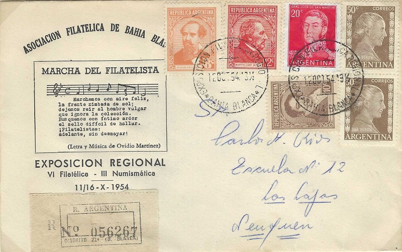 Otro Himno del Filatelista o "MARCHA FILATELISTA" en carta argentina de la ASOCIACION FILATELICA DE BAHIA BLANCA fechada el 12-10-1954.