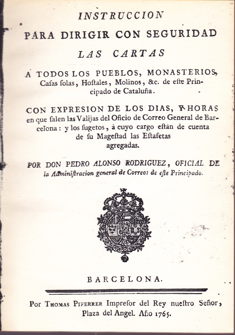 INSTRUCCION PARA DIRIGIR CON SEGURIDAD LAS CARTAS A TODOS LOS PUEBLOS, MONASTERIOS, CAFAS FOLAS, HOFTALES, MOLINOS, &C. DE ESTE PRINCIPADO DE CATALUÑA.